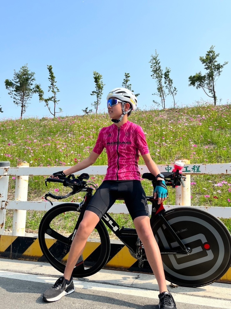 除了語言,我也熱愛體育,尤其是鐵人三項。最初,我只是單純喜歡騎車,沒想到一次接觸鐵人比賽後,便深深被這項運動吸引。還記得第一次參加比賽時,我連游泳都游得搖搖晃晃,到轉換區轉換的時候總是手忙腳亂。騎車時風強到幾乎睜不開眼睛,跑步階段更是靠著意志力撐完。比賽結束時我累到連話都說不出來,但當我踩過終點的那一刻,從腳底一路湧上的不是疲憊,而是一種說不出的快樂和成就感,那種瞬間讓人覺得,一切的努力都值得了。