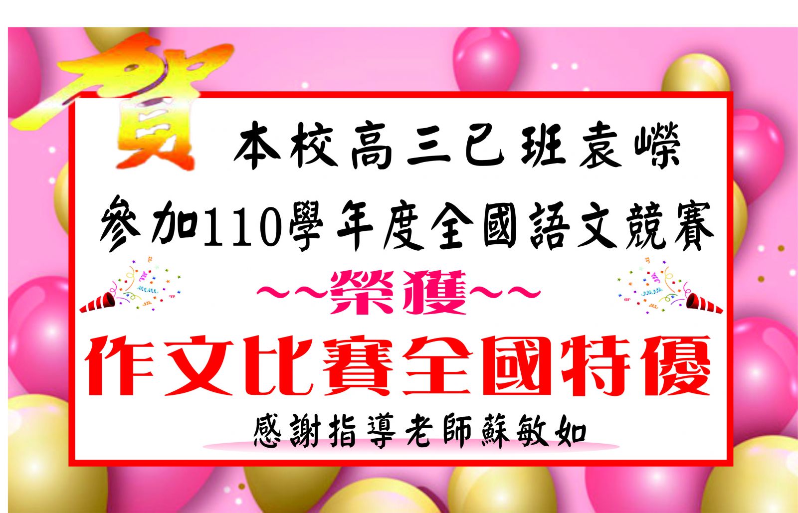 賀!本校高三己袁嶸同學代表臺中市參加全國語文競賽作文比賽,榮獲全國特優!