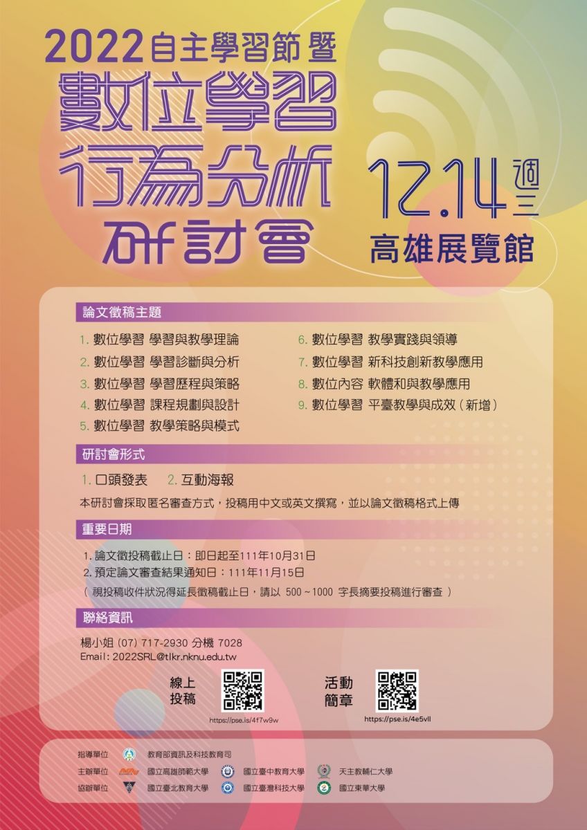 轉知國立高雄師範大學辦理「2022自主學習節暨數位學習行 為分析研討會」徵稿重點