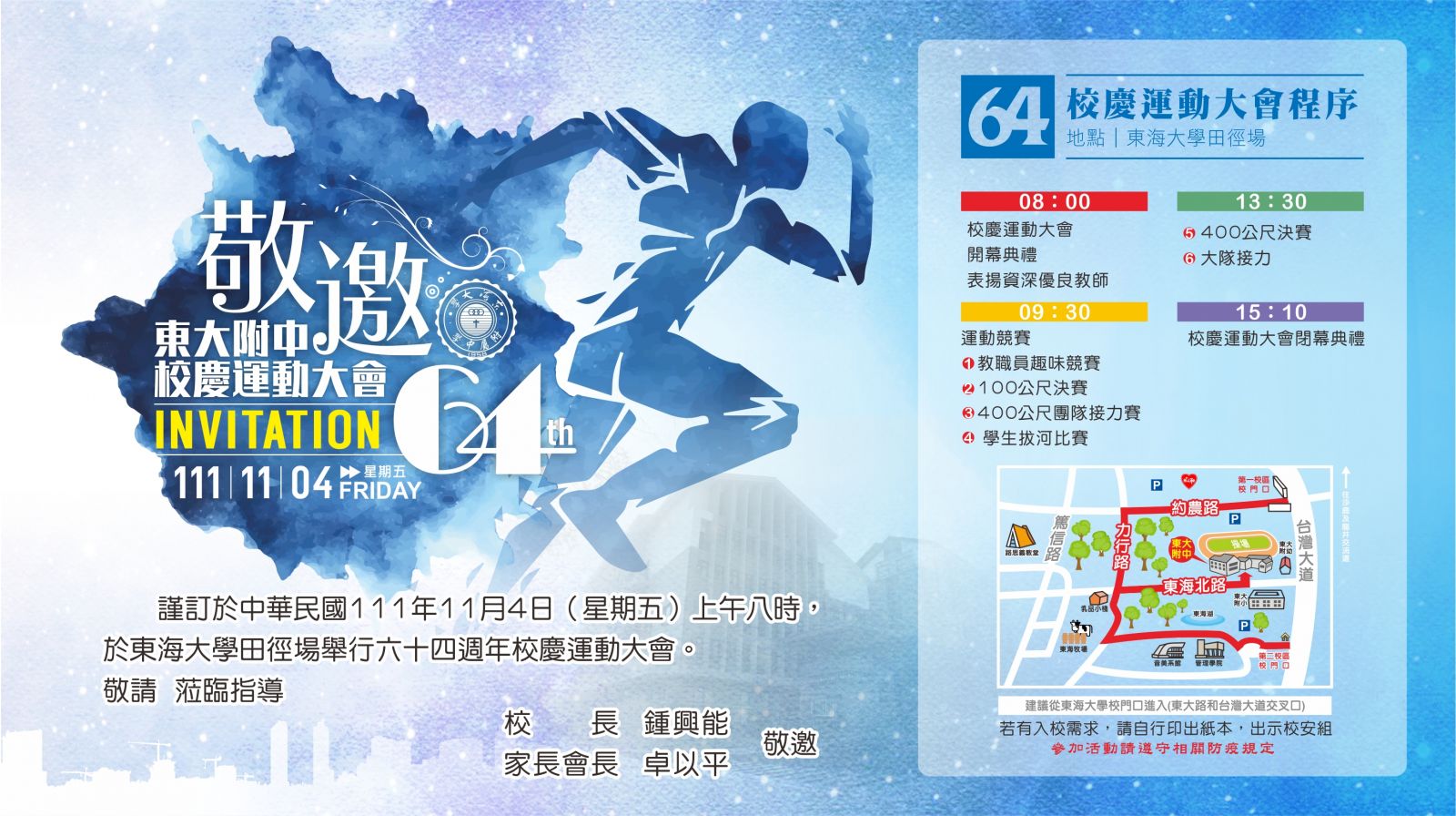 本校64週年校慶運動會即將於11月04日星期五上午展開,本次運動會為響應環境保護,不提供紙本邀請函,若有入校需求,請自行印出紙本,於入校時主動出示,也鼓勵來賓搭乘大眾運輸工具前來參與。本次會場不提供杯水、瓶裝水,如有需要飲水的同學或家長,請自行攜帶環保杯前往教學區1樓飲水機取用。誠摯邀請您一起來共襄盛舉、同祝校慶!