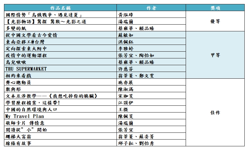 111學年度財團法人東海大學附屬高級中等學校獎勵優良課程革新競賽得獎作品如下: