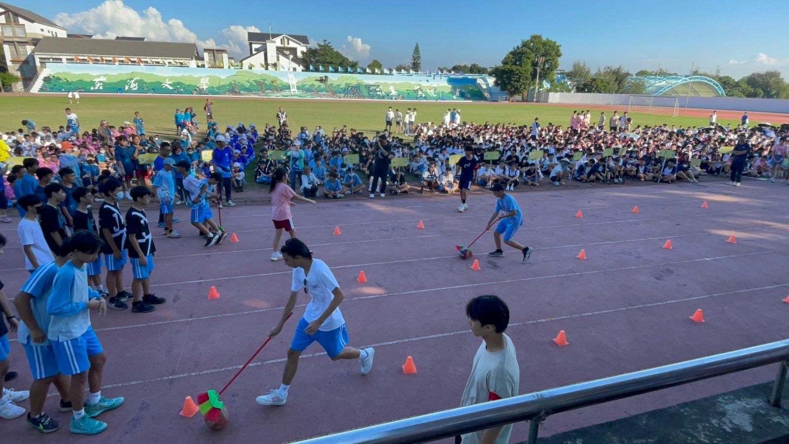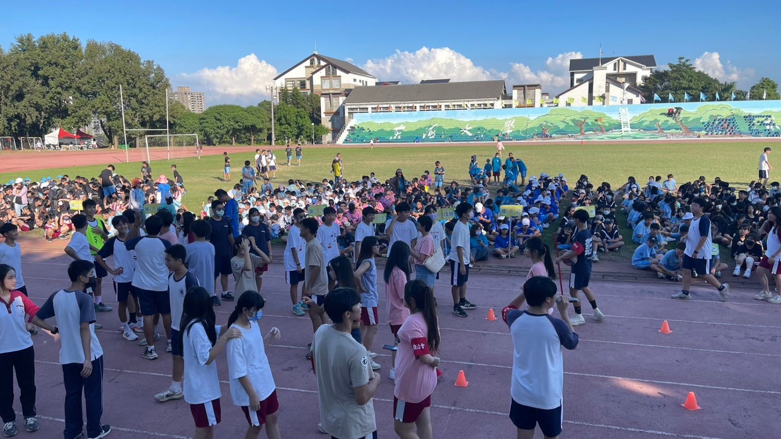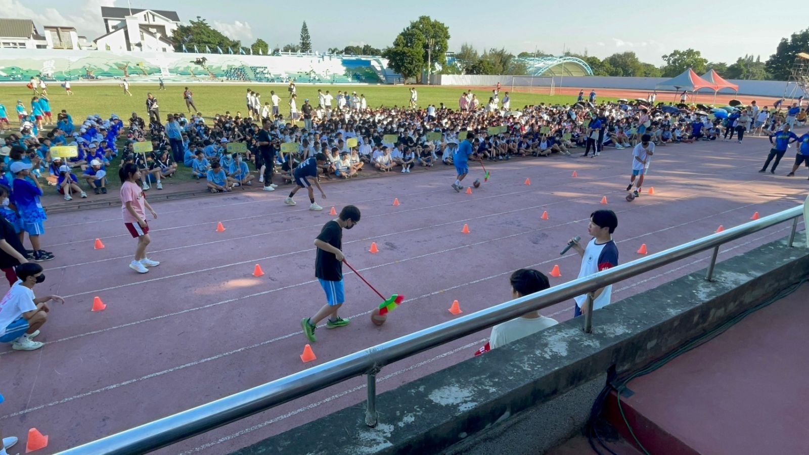 在運動會前的一個禮拜,我開始在網路上搜尋各種主持方法和觀看各種相關活動的主持影片,當然這些都比不過直接從當天上午的教師趣味競賽中取得經驗還要來得快速,上午的羅老實在主持的太好了,導致我在看完羅老的主持後就一直處於非常緊張的狀態,我不知道自己是否能做的跟羅老一樣好,也害怕如果沒辦法主持好會搞砸了這一場本該是非常歡樂的競賽,所以比賽開始前,我不斷地在腦中沙盤推演著各種流程、細節,到了趣味競賽開始前十分鐘我拿著麥克風看著底下密密麻麻開始集合的同學們,心中的緊張感不由得被提到了最高點。