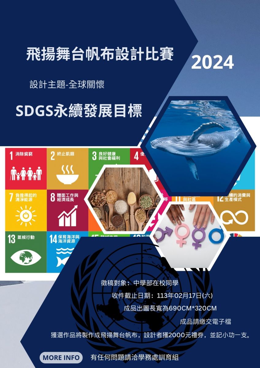 說明:由於氣候變遷、經濟成長、社會平權、貧富差距等難題如重兵壓境,2015年,聯合國宣布了「2030永續發展目標」(Sustainable Development Goals, SDGs),包含17項核心目標。這是目前全球關心的議題,希望透過舞台背板的設計,在校園中營造全球關懷議題的氛圍。