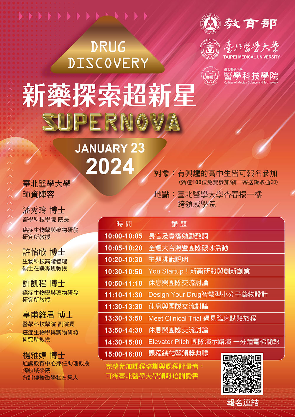 一、臺北醫學大學醫學科技學院潘秀玲院長團隊執行教育部補助大專校院STEM領域及女性研發人才培育計畫,設計適配高中生學習之「Drug Discovery Supernova新藥探索超新星科普培訓計畫」課程活動,擬訂於民國113年1月23日(二) 10:00-16:00於臺北醫學大學跨領域學院辦理,報名方式為線上報名,報名連結https://pse.is/5f8s32,請欲報名者參見報名表內詳細資訊並填寫相關內容,報名截止日期為112年12月31日。
