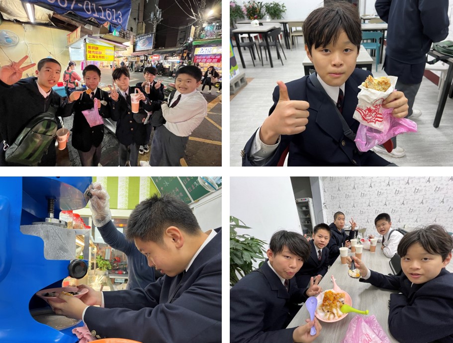 緊接著下來,日本同學分批投入了上午的隨班課程體驗,所有課程緊湊且充實多元,不僅涵蓋中文的各類專業科目、體育,還有外語等各式多姿多彩的學習體驗。中午,日本同學也一併體驗了台灣學生的中午團體用餐生活。下午,他們前往東海大學著名景點——乳品小棧,近距離觀賞可愛的乳牛,感受了東大附中獨特的藏身於市區中的農業風光。隨後,陳怡誠主任帶領他們參觀了東大附設幼兒園,並進行了一場摺紙文化的跨文化交流饗宴。稍作休息後,傍晚到晚間,由黃鐦逸老師親自帶領日本同學品嘗東海夜市的各類小吃與美食,彷彿在一場目不暇給的美食之旅中穿梭。他們品嘗了雞腳凍、福州包、珍珠奶茶、蔥抓餅、滷肉飯、雞排、鹹酥雞、刨冰、甜點蛋糕、地瓜球…等,日本同學們皆表示:回味無窮!但還是有位日本同學對臭豆腐退避三舍,最後幾乎每位同學都買了好多可愛的紀念品滿載而歸,日本老師特別表達對黃老師的耐心帶領與解說之佩服與感激,一路上還伴隨著音樂哼著歌回到宿舍,日本同學開心地說:「今天好累,但超開心!」。