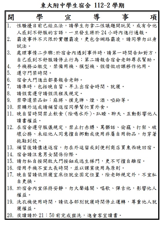 財團法人東海大學附屬高級中等學校--學生宿舍-112-2 開學住宿生宣導事項