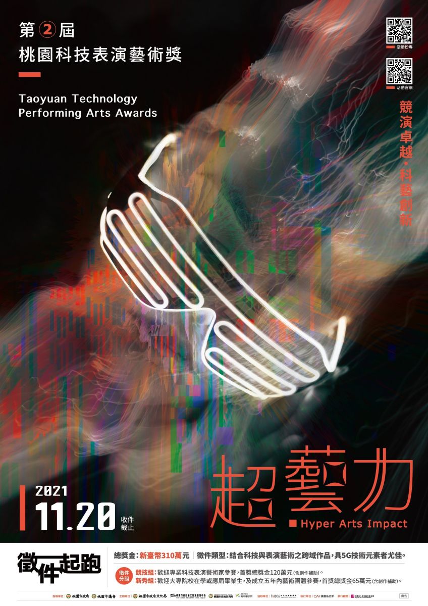 桃園市政府辦理第二屆「桃園科技表演藝術獎」,以「超藝力」為主題,分為競技組與新秀組,總獎金為新臺幣310萬元,自110年9月20日起至11月20日止開放網路報名,得獎作品將安排於「2022TAxT桃園科技藝術節」進行演出,詳細辦法請見附件資訊。