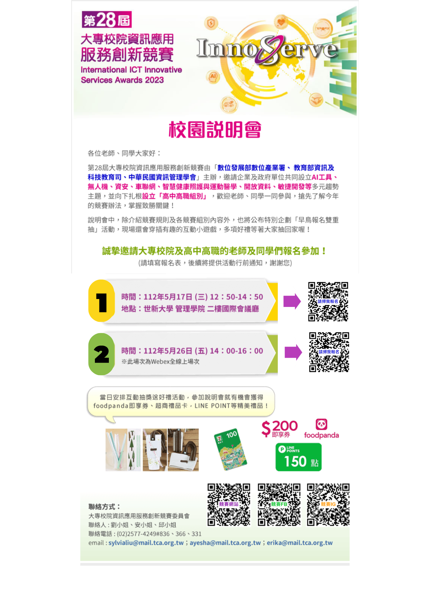 教育部轉知台北市電腦商業同業公會辦理「2023第28屆大專校院資訊應用服務創新競賽」(含高中高職組)校園說明會。
