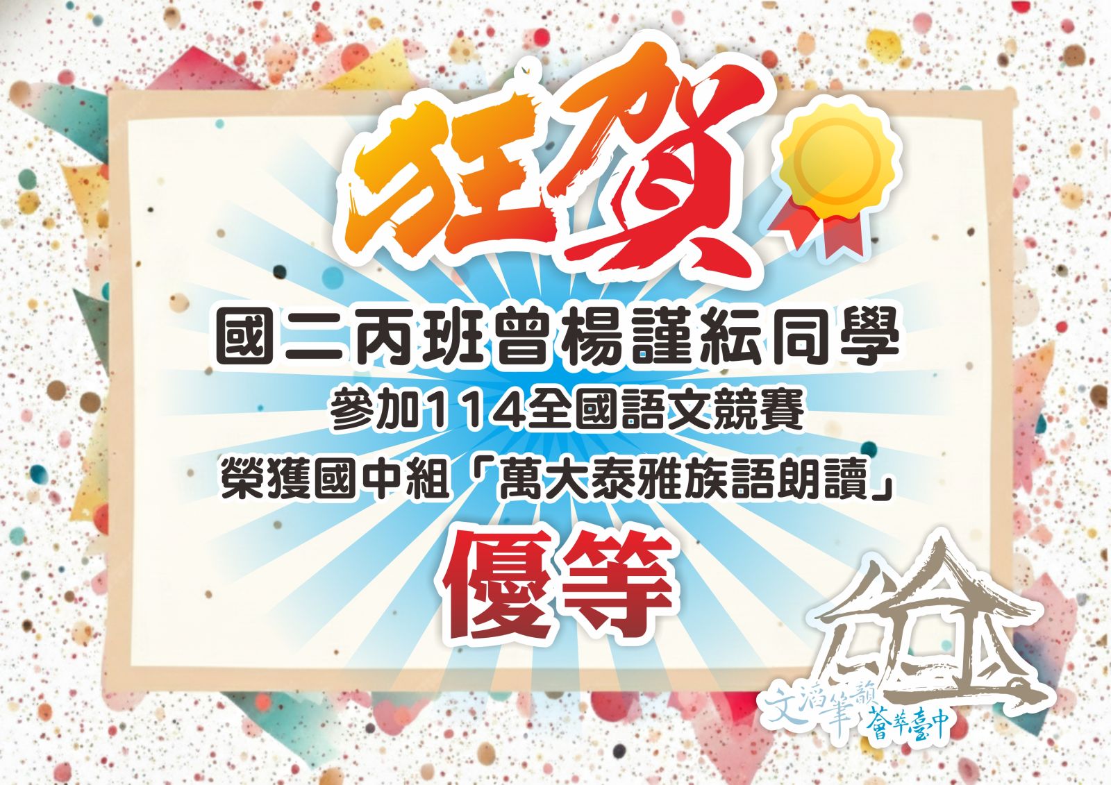 賀~國二丙班曾楊謹紜同學參加114全國語文競賽, 榮獲「萬大泰雅族語朗讀」 國中組優等