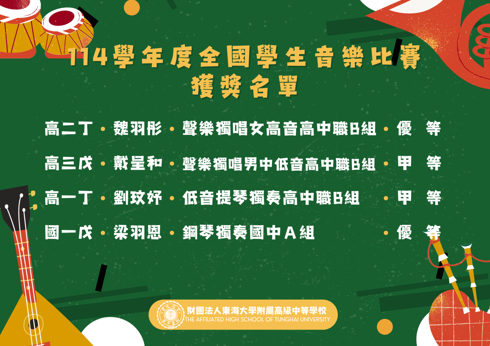 財團法人東海大學附屬高級中等學校--榮譽榜-114學年度全國學生音樂比賽-個人賽,本校參賽學生榮獲佳績!