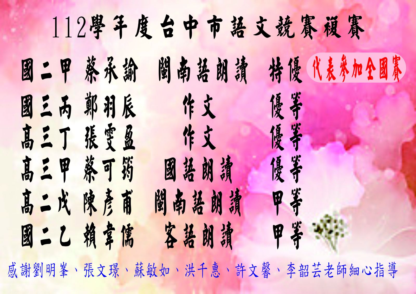 賀~本校學生參加112年台中市語文競賽複賽,榮獲佳績!