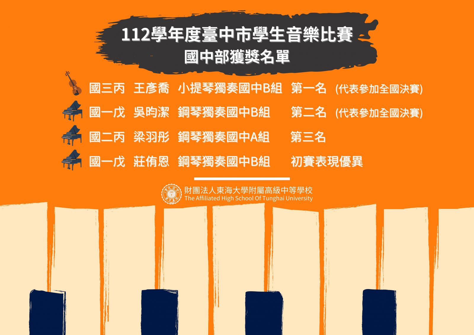 財團法人東海大學附屬高級中等學校--榮譽榜-112學年度臺中市學生音樂比賽-個人賽,本校參賽學生表現優異!