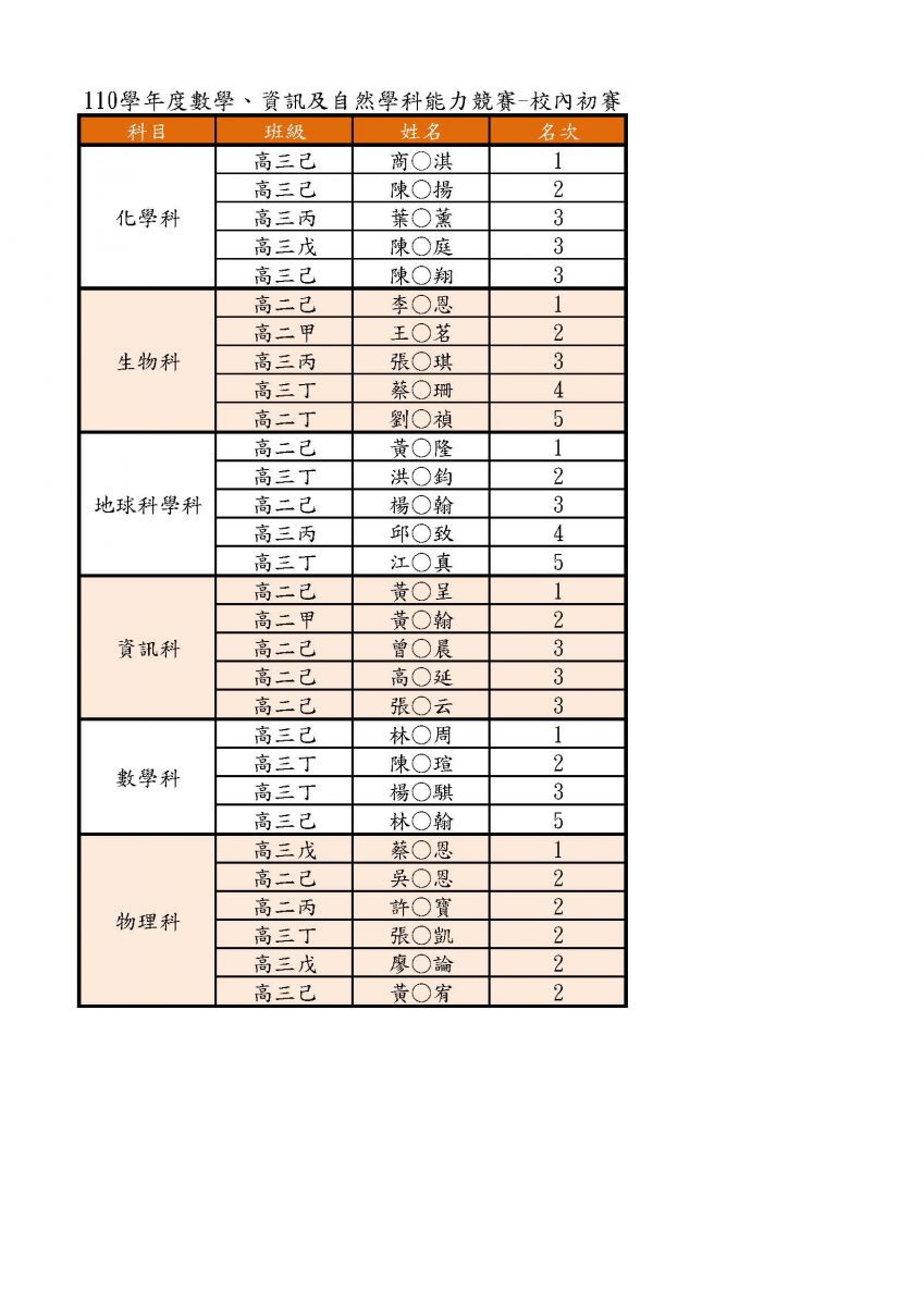 110學年度數理及資訊學科能力競賽校內初賽成績優秀名單