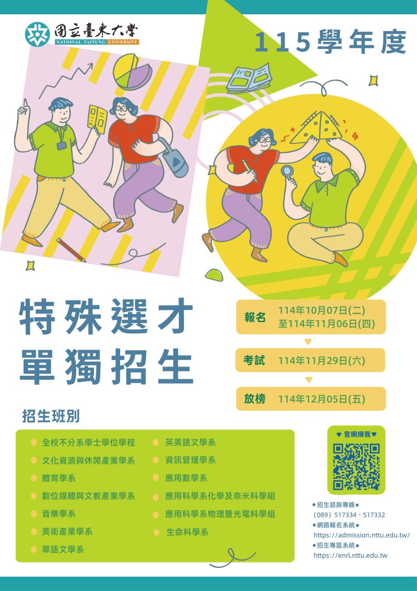 財團法人東海大學附屬高級中等學校--升學快訊-國立臺東大學115學年度特殊選才