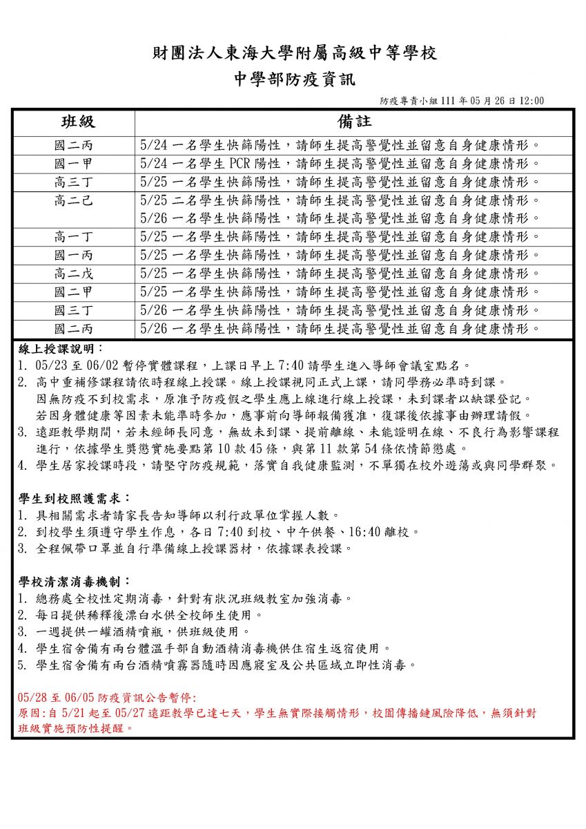 財團法人東海大學附屬高級中等學校--升學快訊-防疫資訊5/26更新