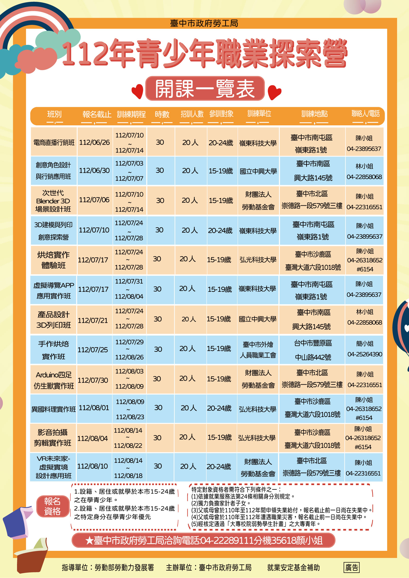 一、為協助設籍、居住或就學於臺中市15-24歲之在學青少年對於職業有正確認知,了解各行業的基本技能及專業職能要求,並發掘自身職業興趣,臺中市政府勞工局今(112)年度「青少年職業探索營計畫」,共開辦12班次課程,協助青少年進行職業探索,請逕洽訓練單位報名。