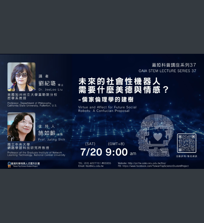 轉知~國立中央大學辦理線上講座:《蓋婭科普講座系列37》—— 「未來的社會性機器人需要什麼美德與情感?儒家倫理學的建樹」,歡迎本校師生踴躍參加。