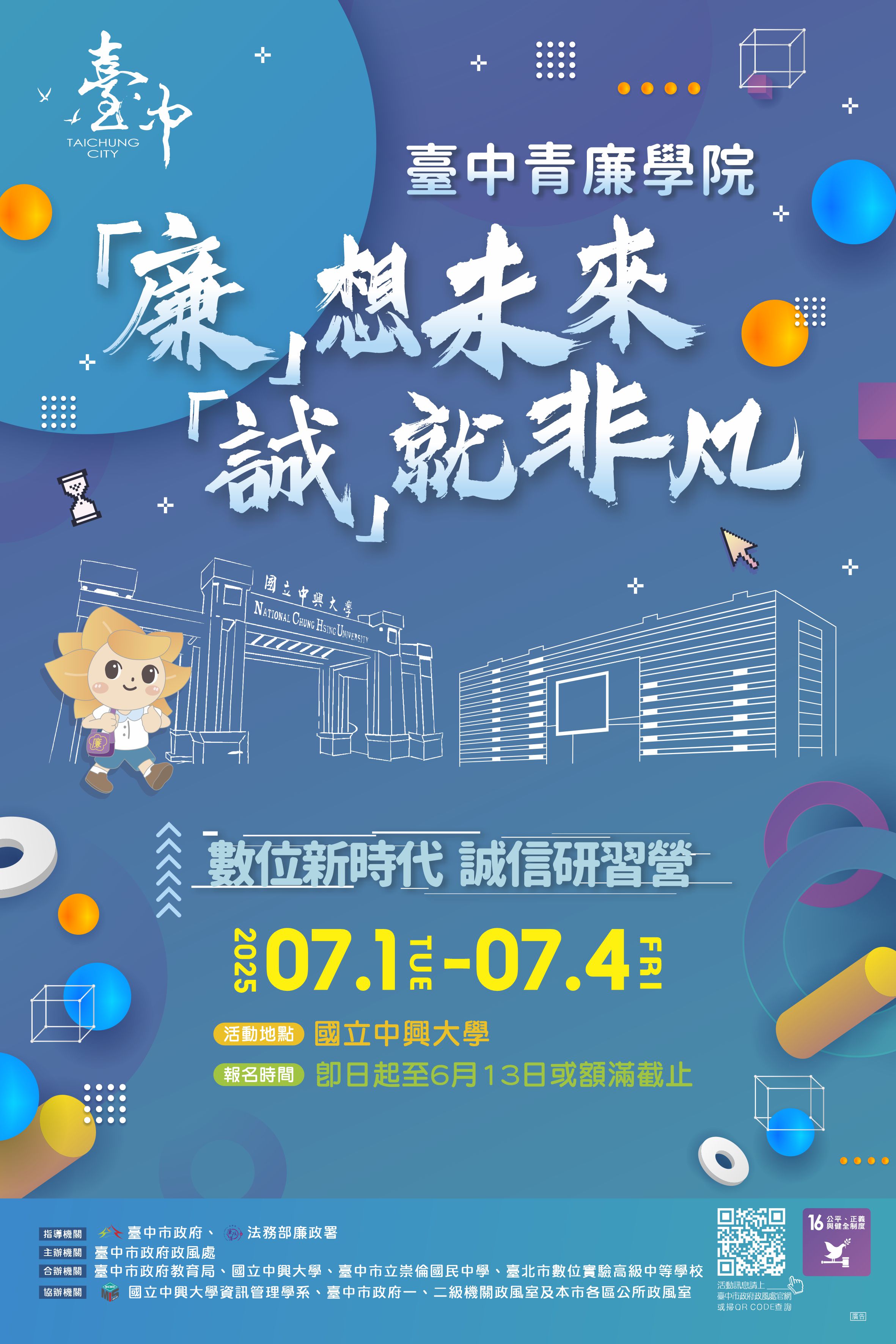 臺中市政府政風處將於114年7月1日至4日辦理「『廉』想未來 『誠』就非凡數位新時代誠信