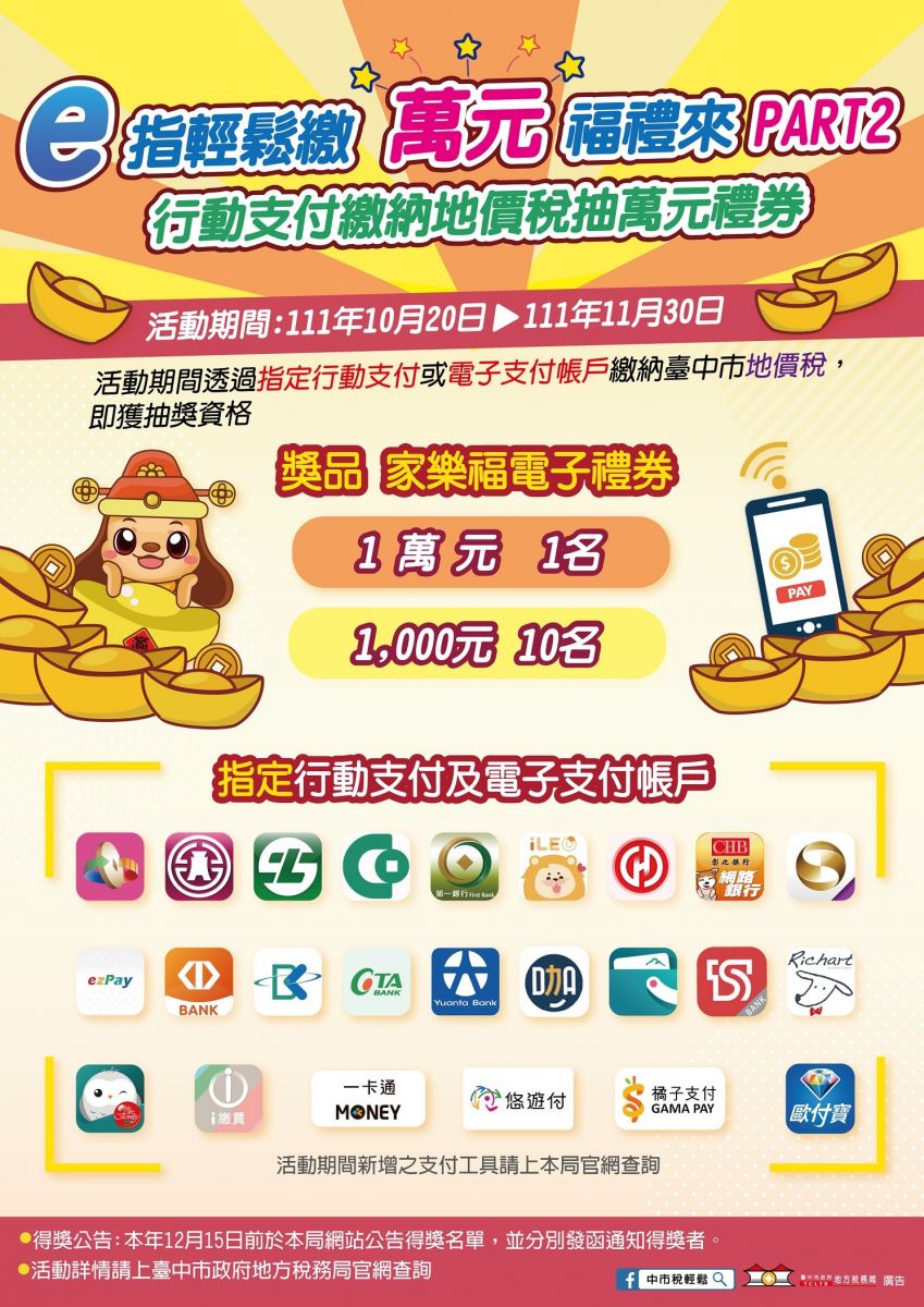 台中市地方稅務局提醒納稅義務人如期繳納本(111)年度地價稅,並利用多元管道開徵。