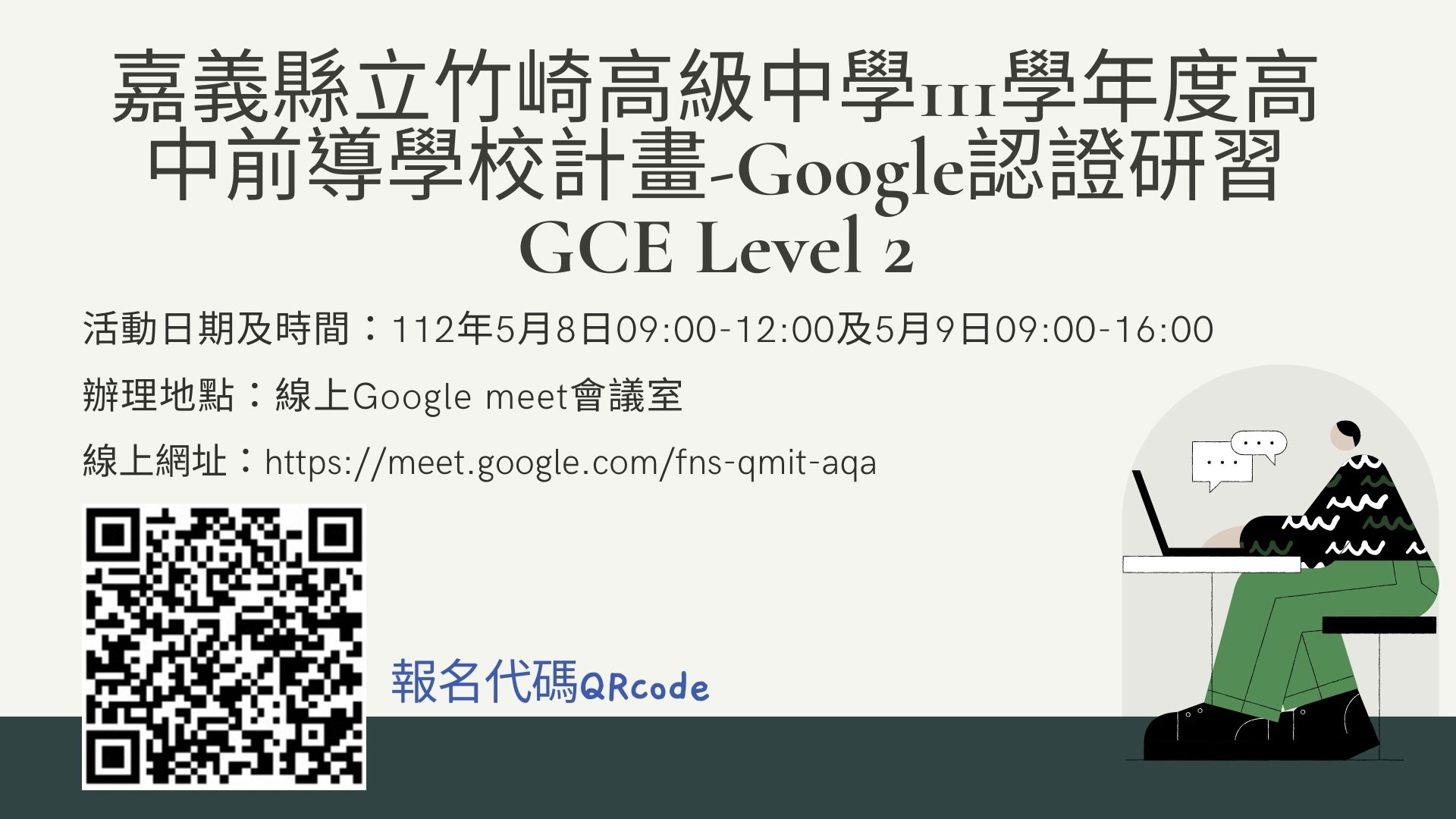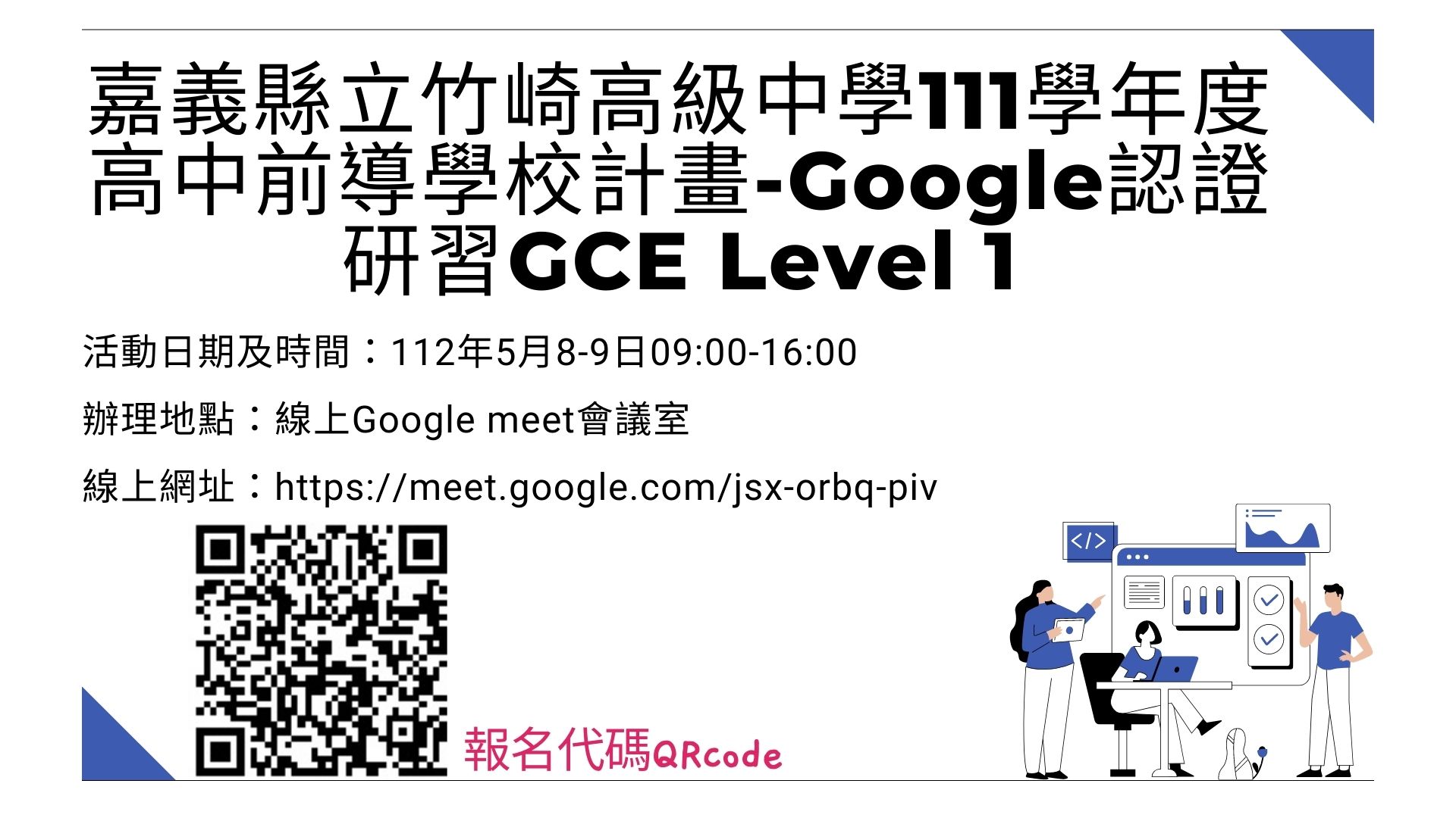 三、研習地點:Google meet 線上會議室,網址如下 嘉義縣立竹崎高級中學111學年度高中前導學校計畫-Google認證研習GCE Level 1:https://meet.google.com/jsx-orbq-piv 、嘉義縣立竹崎高級中學111學年度高中前導學校計畫- Google認證研習GCE Level 2:https://meet.google.com/fns-qmit-aqa
