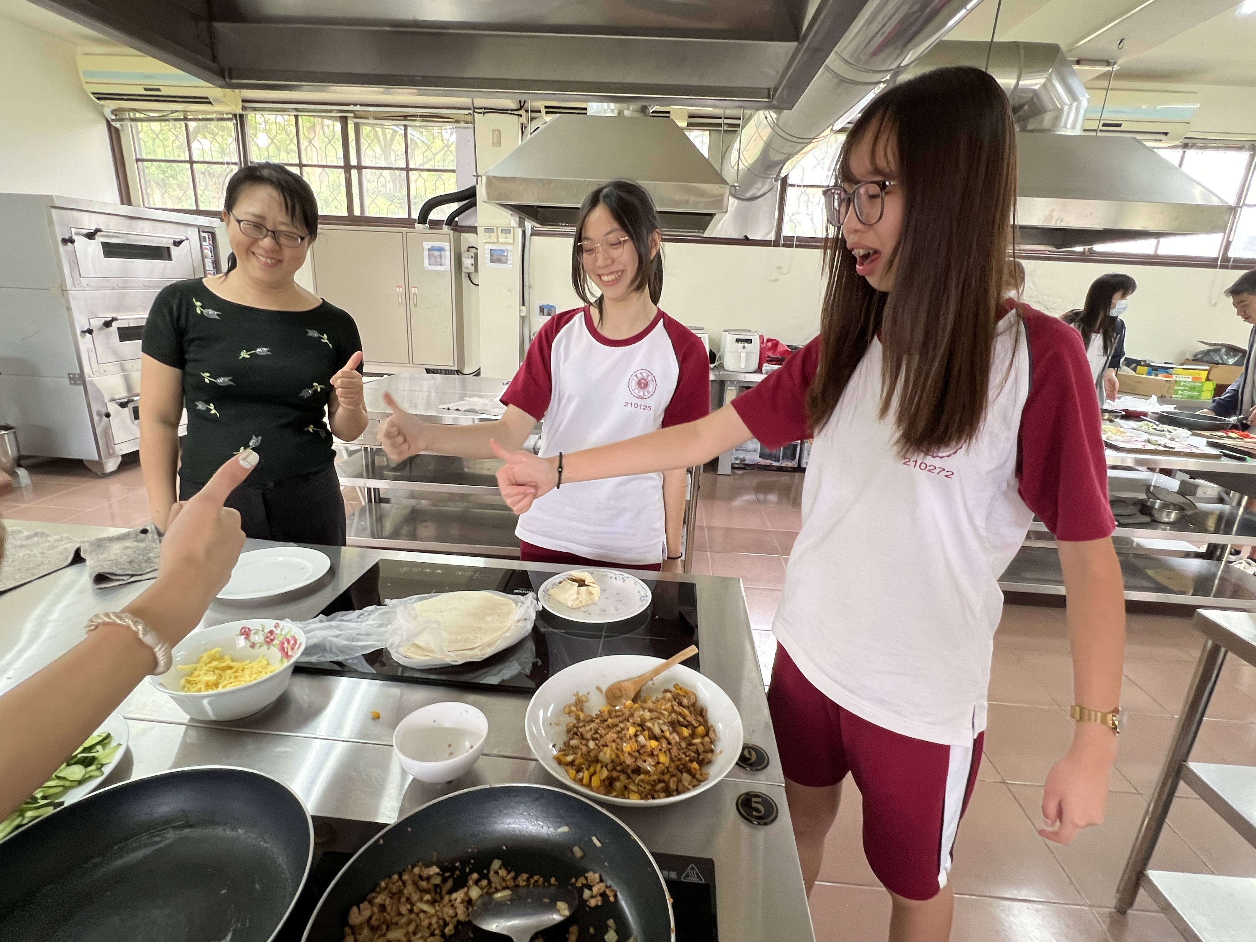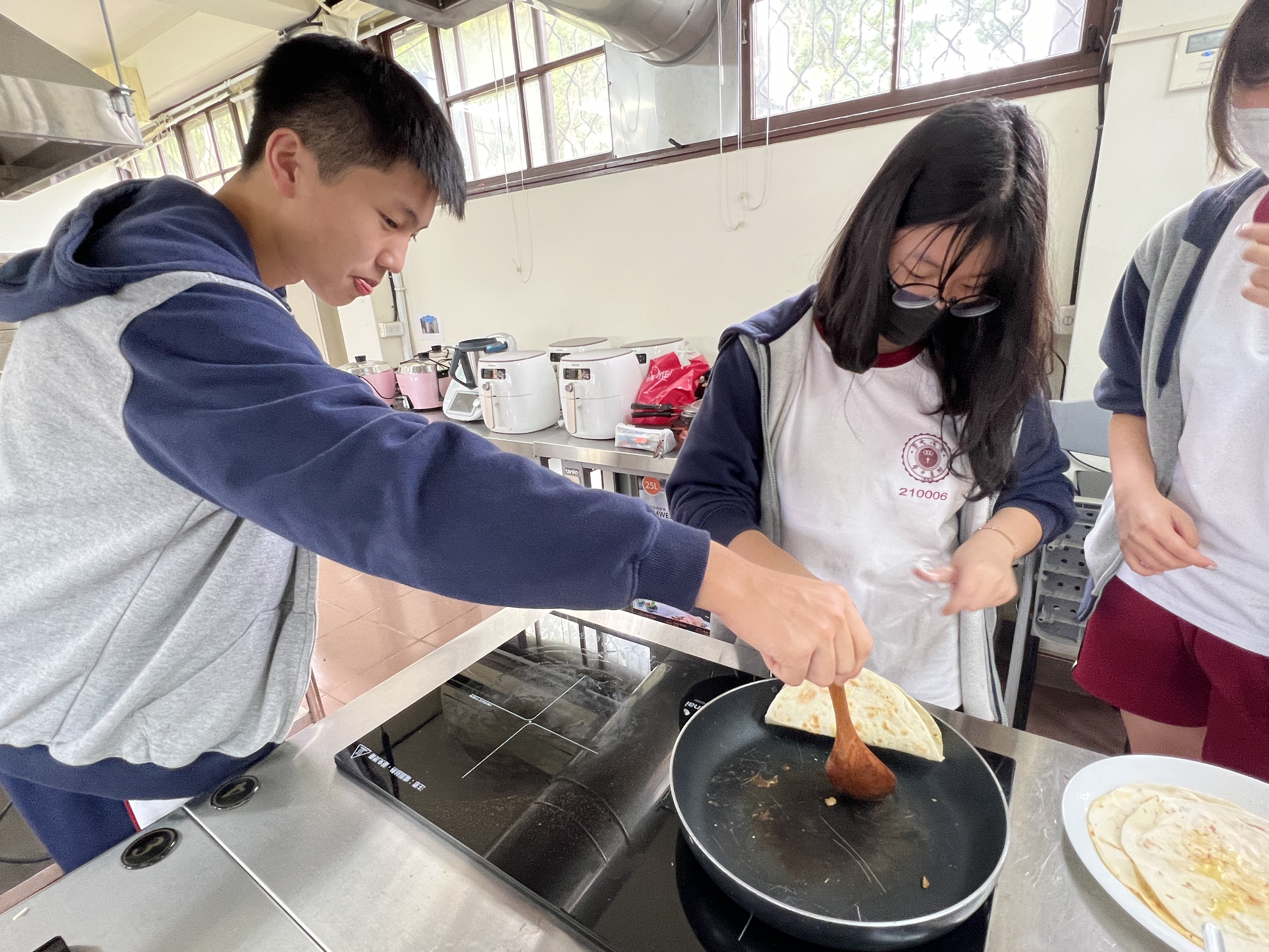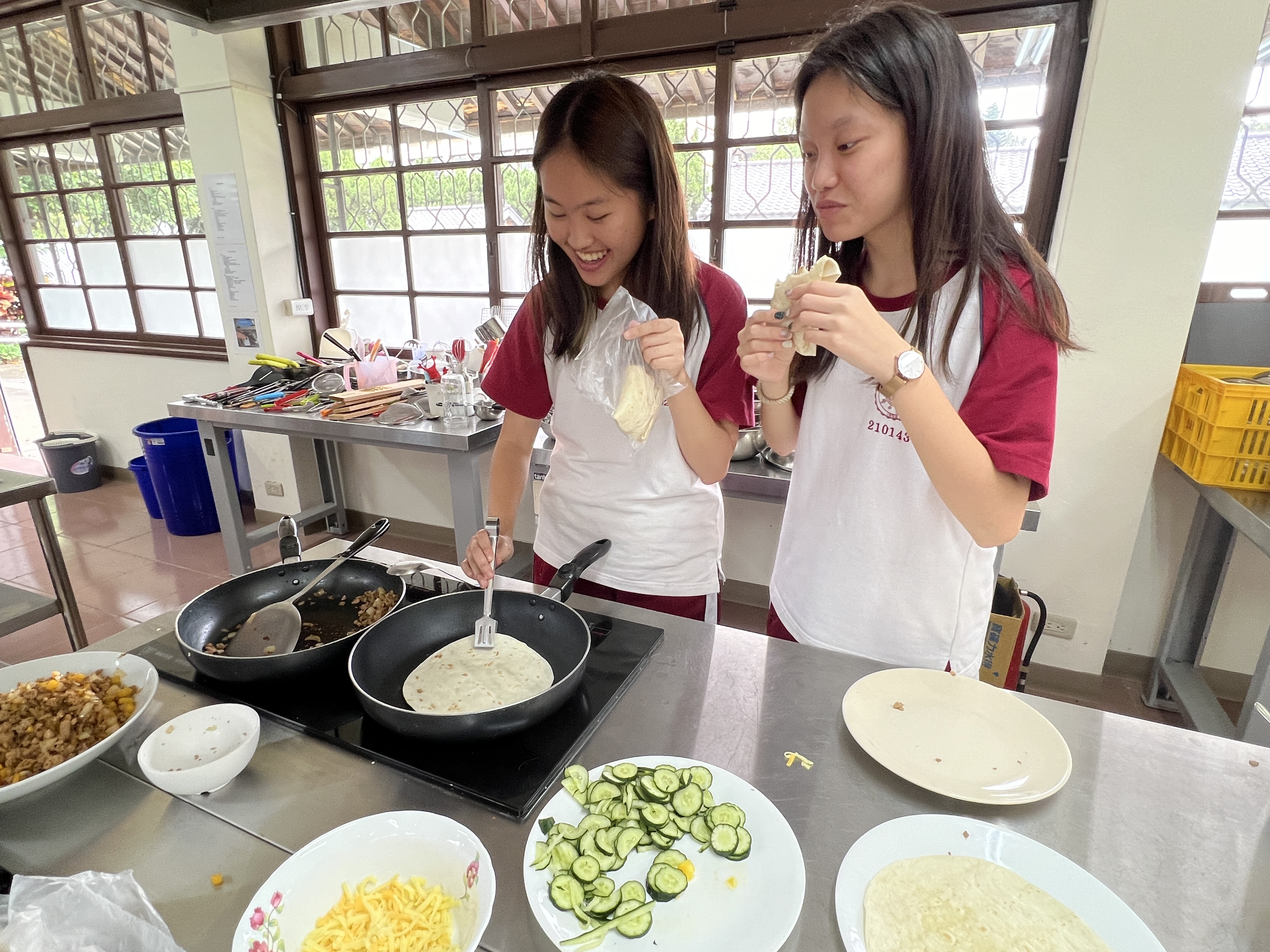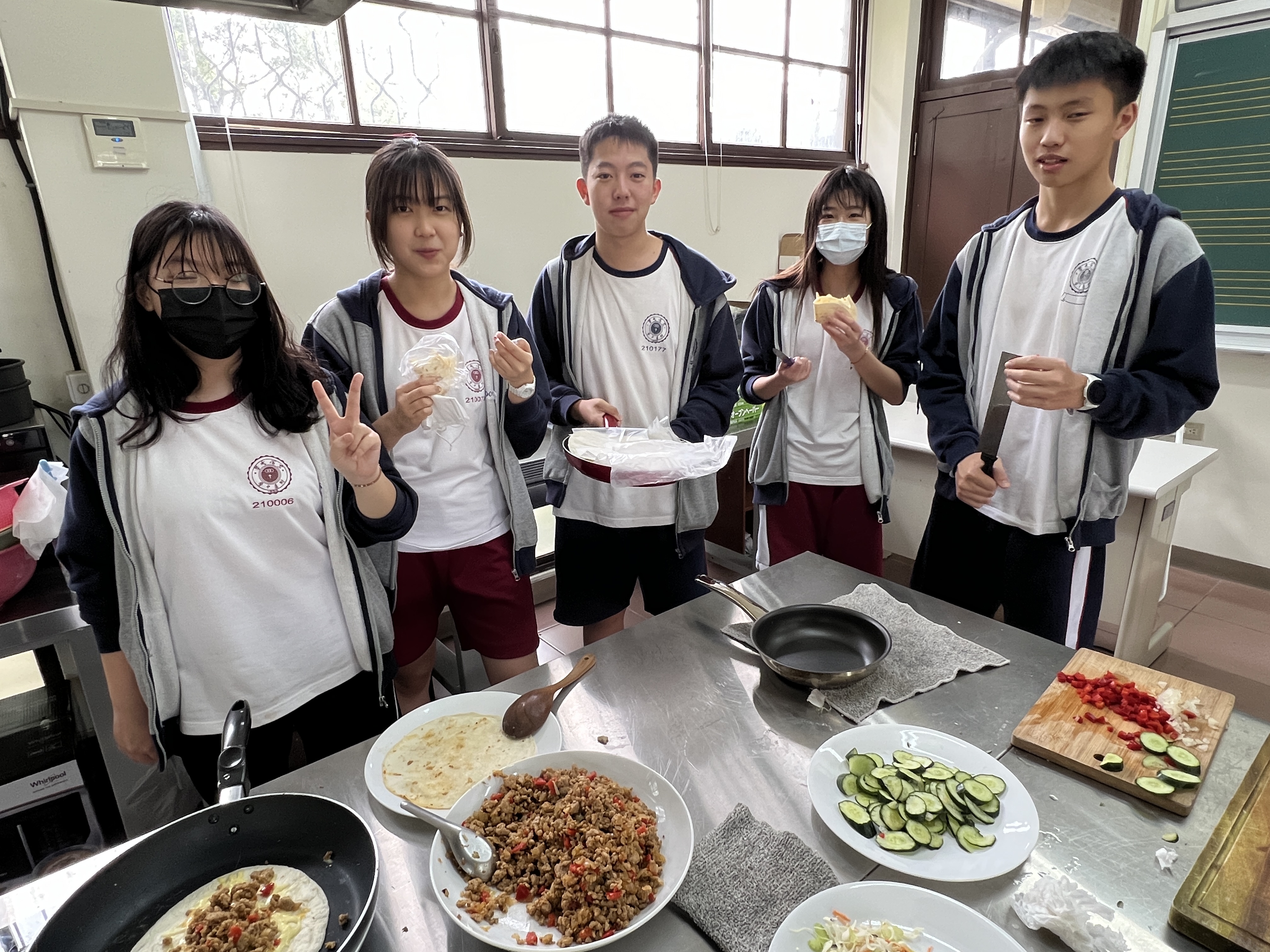在課堂上,學生首先學習了一些基本的西班牙語詞彙和句子,例如點餐時需要用到的常用短語。接著,我們分組進行了實際操作,由王文英老師親自示範和指導我們如何製作墨西哥夾餅。從準備食材到烹飪技巧,王老師都給予學生細致入微的指導,使東大附中的高一學生能夠順利地完成每一道菜式。