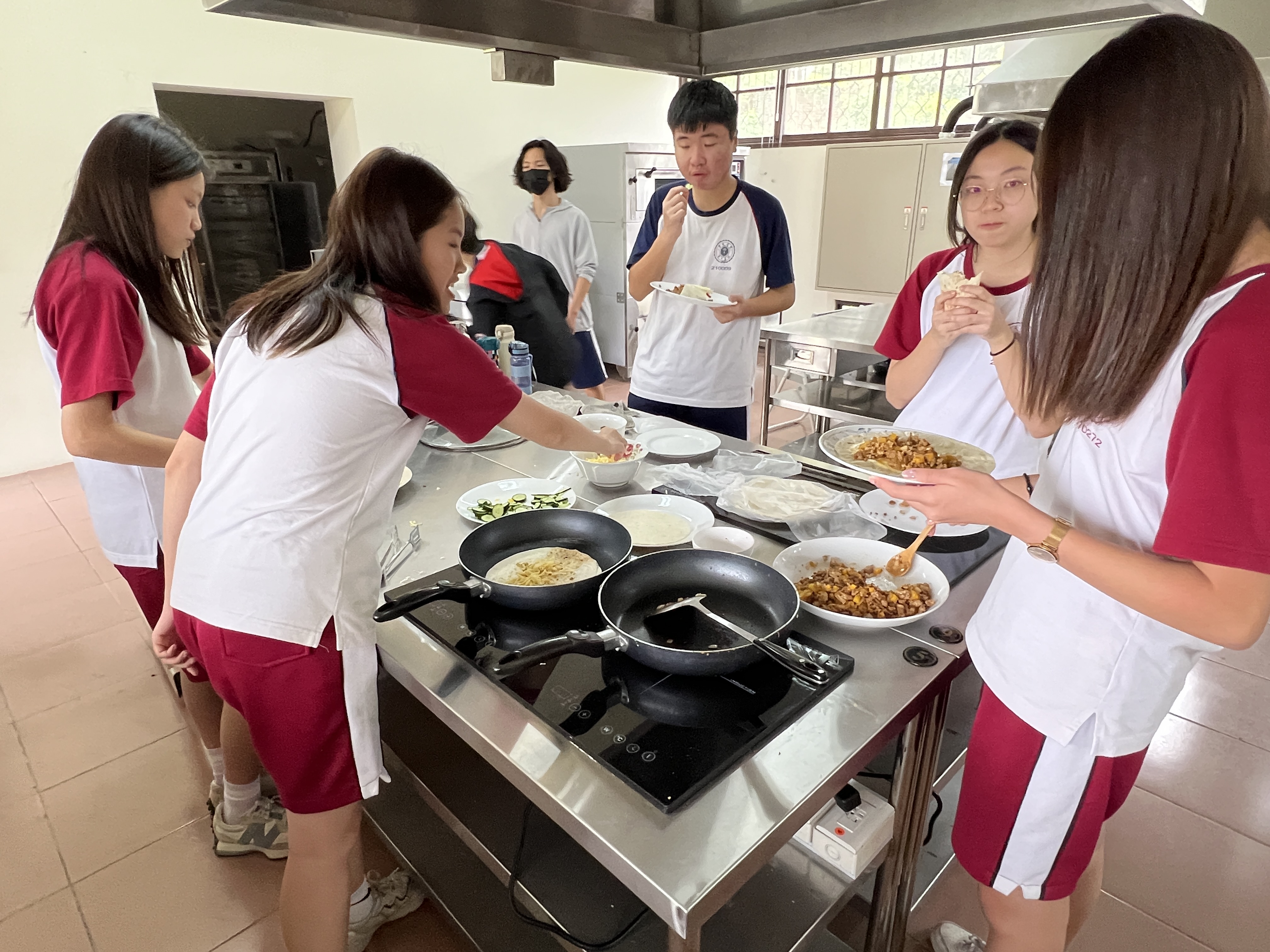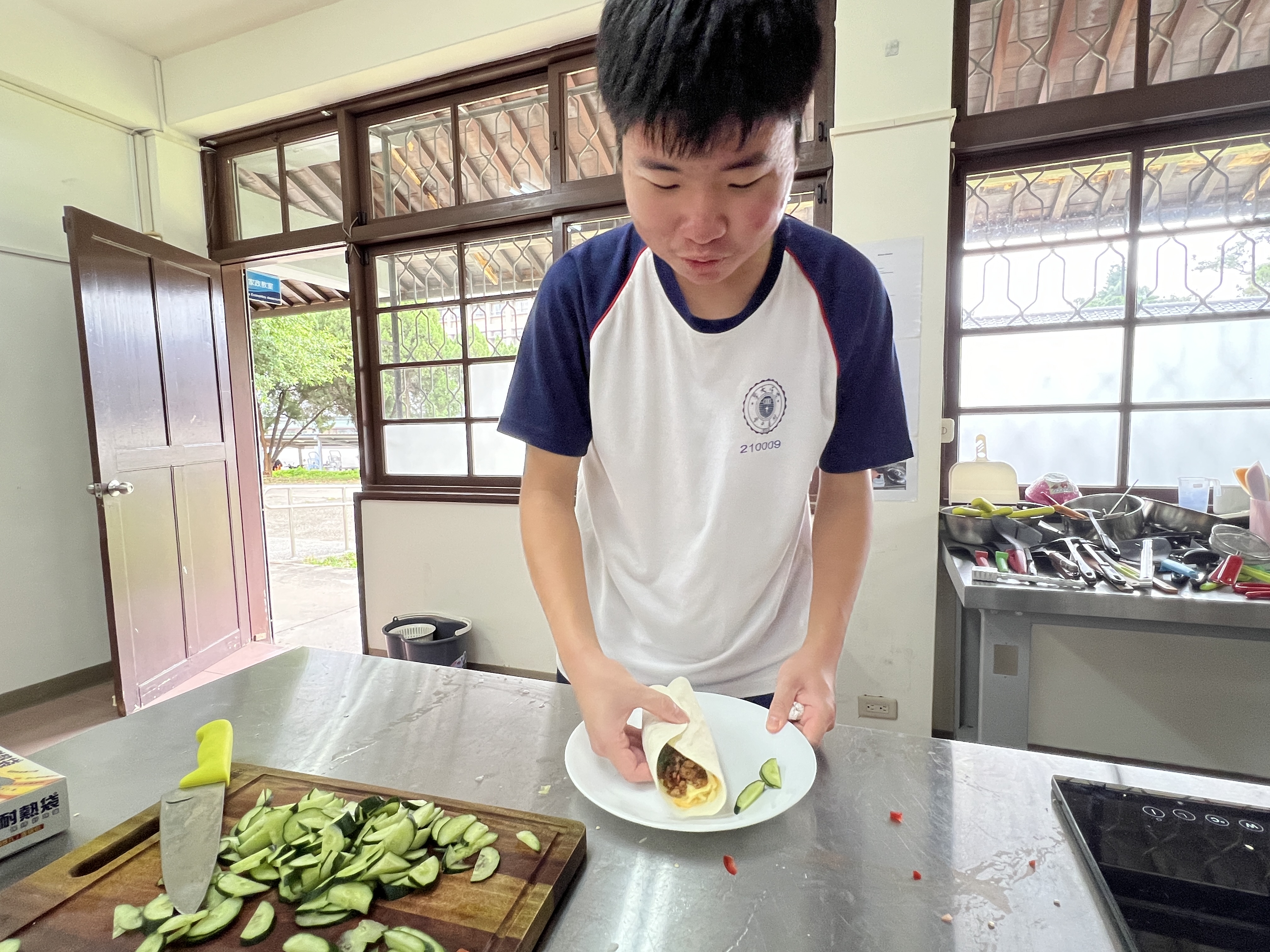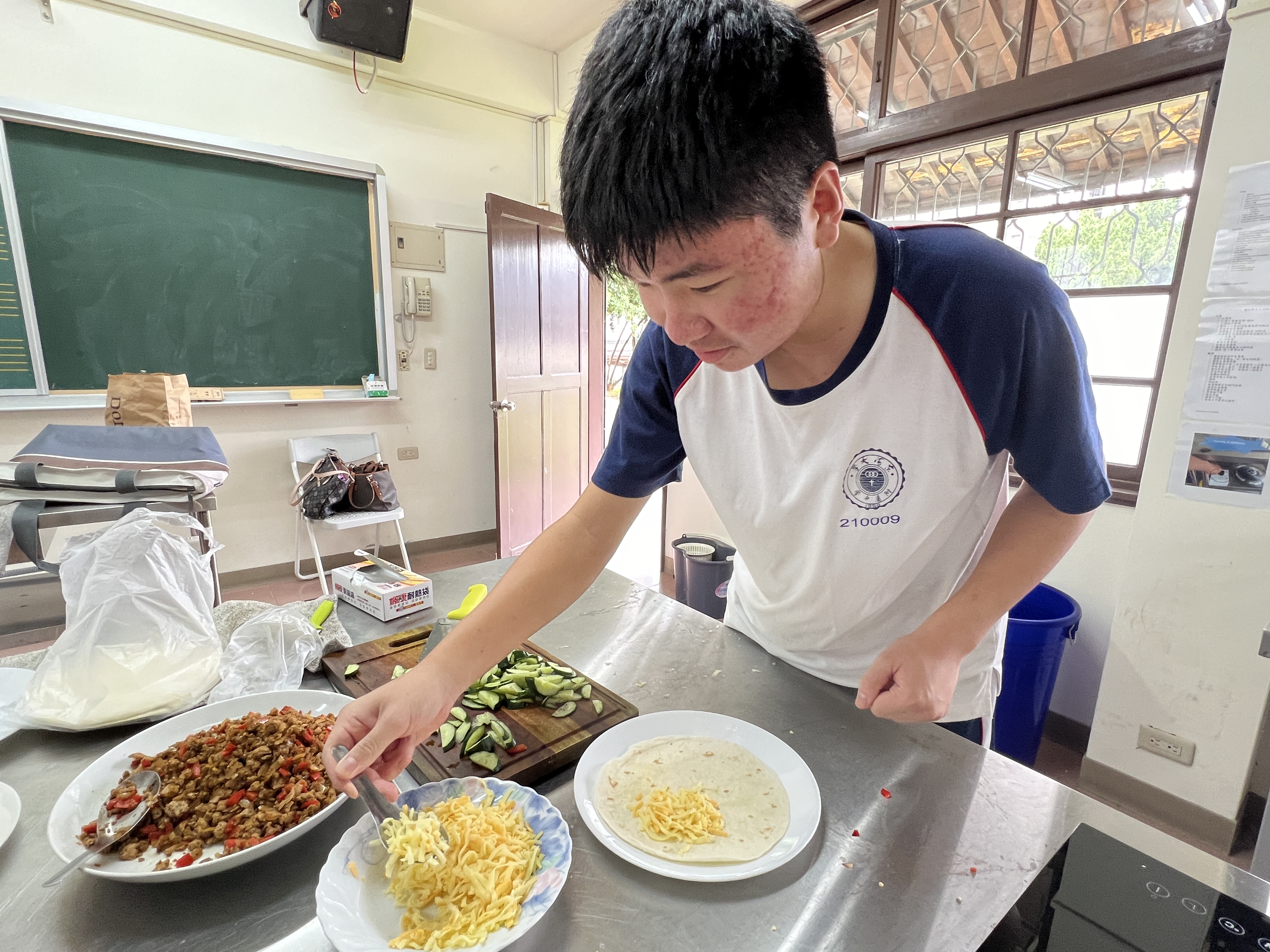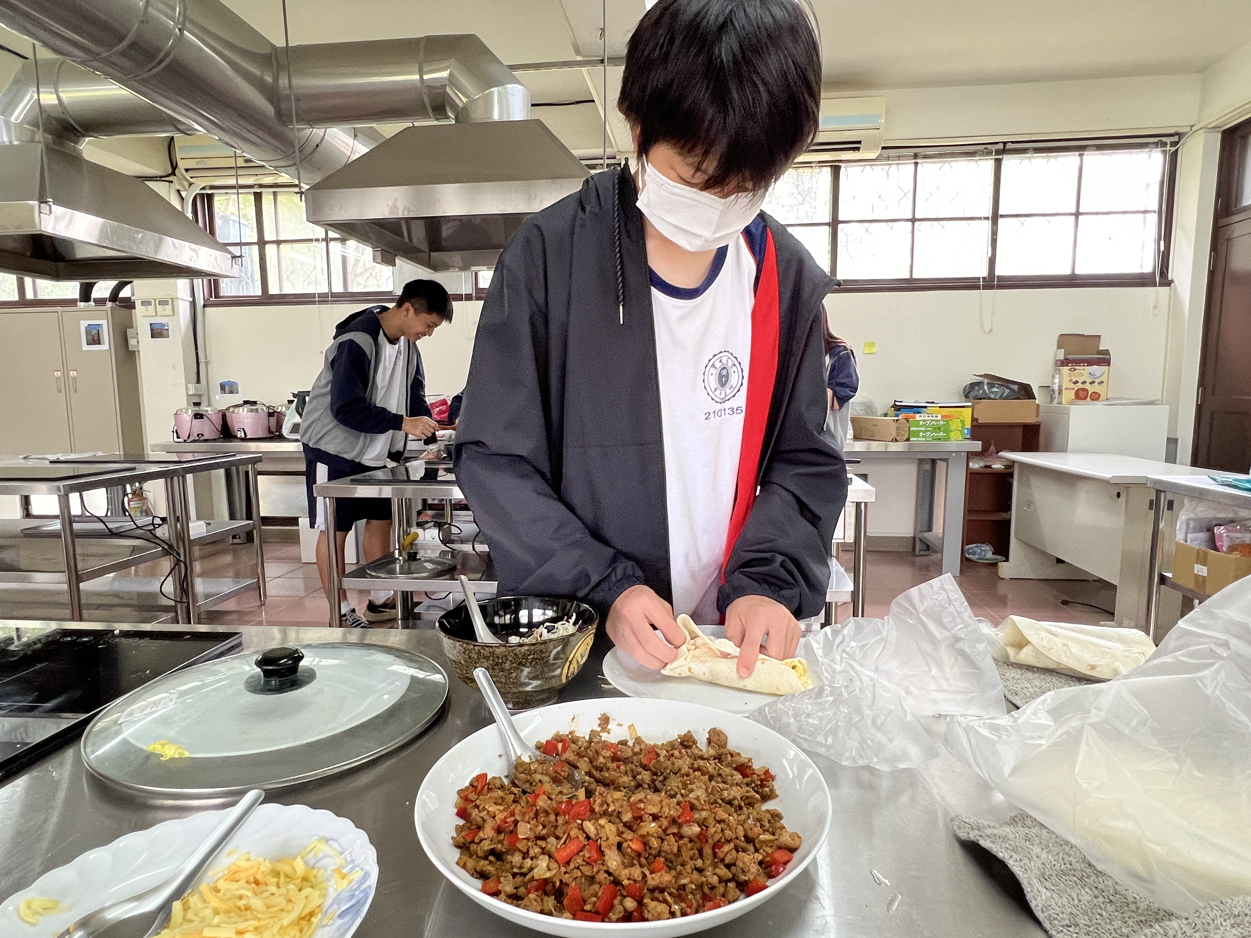 在課堂上,學生首先學習了一些基本的西班牙語詞彙和句子,例如點餐時需要用到的常用短語。接著,我們分組進行了實際操作,由王文英老師親自示範和指導我們如何製作墨西哥夾餅。從準備食材到烹飪技巧,王老師都給予學生細致入微的指導,使東大附中的高一學生能夠順利地完成每一道菜式。