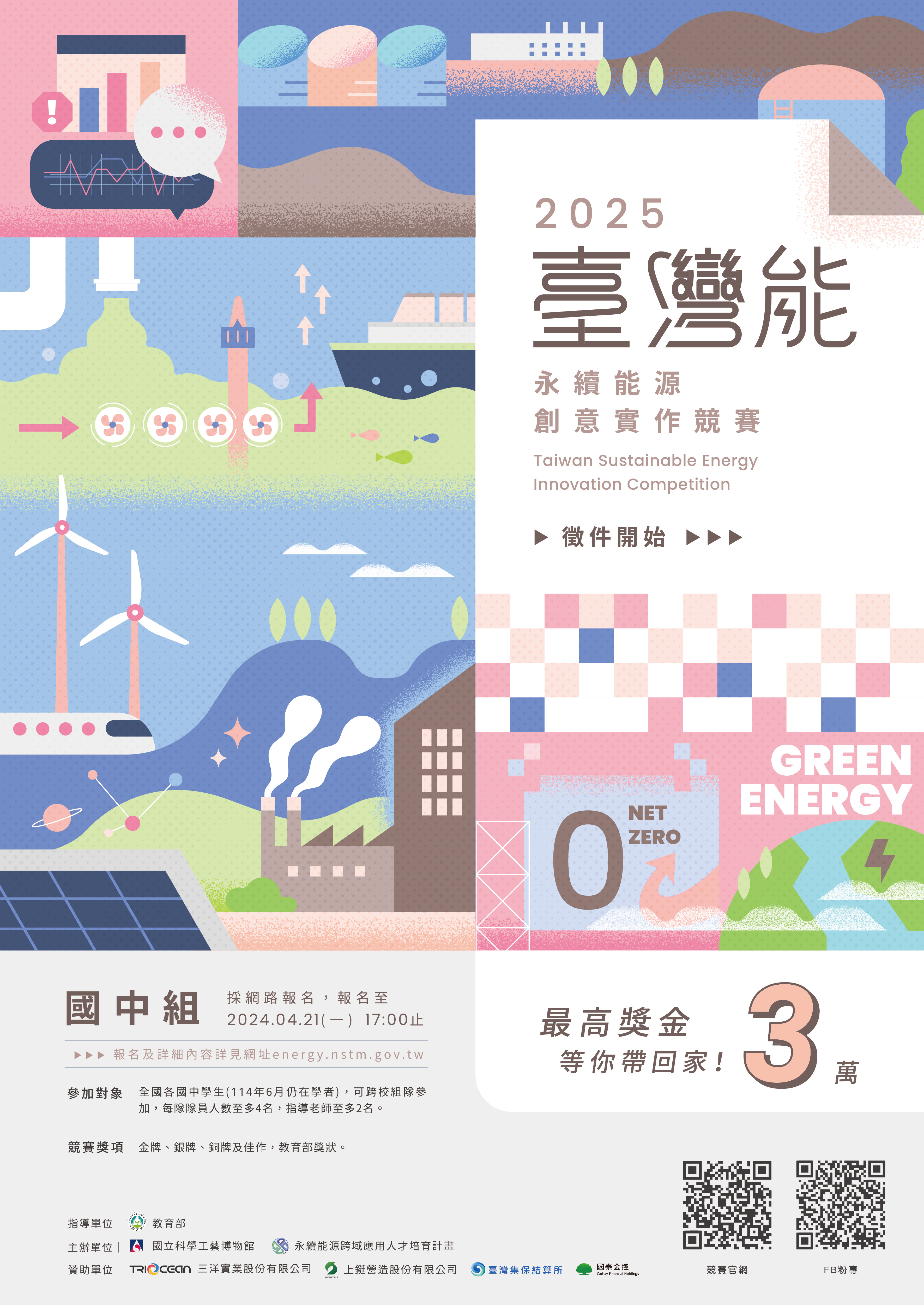 主旨:函轉國立科學工藝博物館主辦之114年度「臺灣『能』-永 續能源創意實作競賽」,國中組競賽電子海報1份,請轉 知所屬國民中學,並請各校鼓勵所屬學生踴躍報名參加, 請查照。