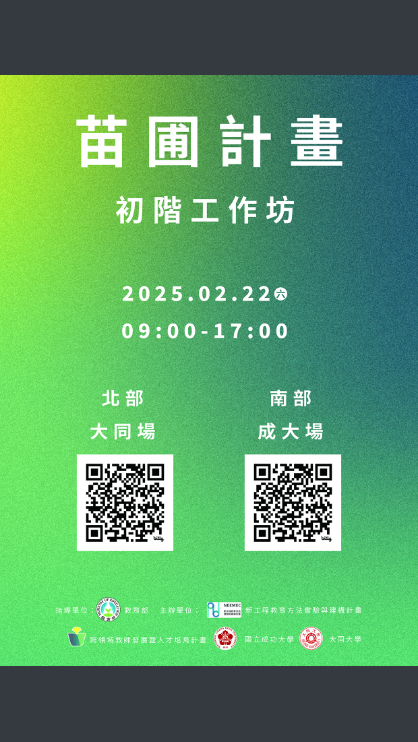 主旨:「教育部跨領域教師發展暨人才培育計畫」將於114年2月22日(星期六)於國立成功大學及大同大學舉辦初階工作坊,敬邀貴校對於導入設計思考教學方式相關議題有興趣之教職員踴躍參與,請惠予轉知....