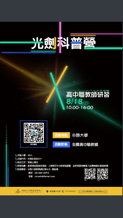 主旨:檢送本校113年8月18日舉辦「光劍科普營」活動海報1份,請惠予公告並鼓勵貴校教師踴躍報名參加,請查照。
