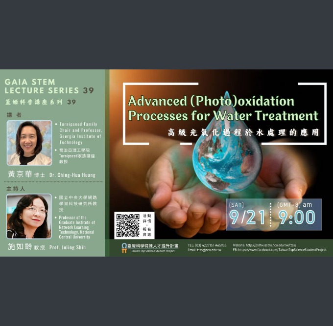 主旨:本校訂於113年9月21日辦理線上講座:《蓋婭科普講座系列39》—— 「高級光氧化過程於水處理的應用」,請惠予公告,並轉知貴校所屬師生踴躍報名參加,請查照。