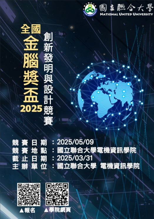主旨:檢送本校電機資訊學院舉辦「2025年金腦獎盃創新發明與設計競賽」活動資訊,敬請惠允公告並轉知所屬師生踴躍報名參加,請查照。