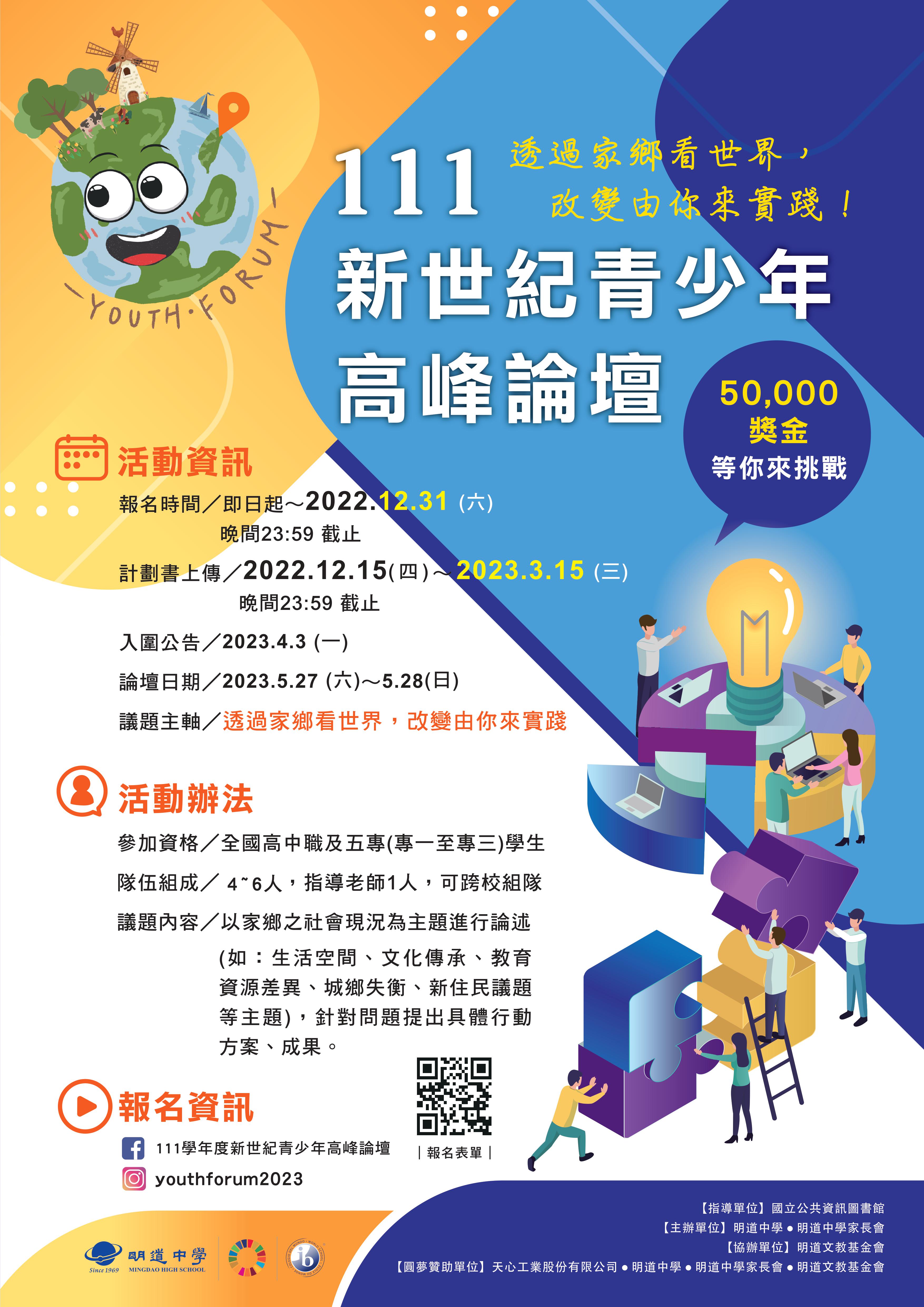 明道中學於2023年5月27、28日辦理「111新世紀青少年高峰論壇」活動,敬邀貴校同學踴躍參與,請查照。