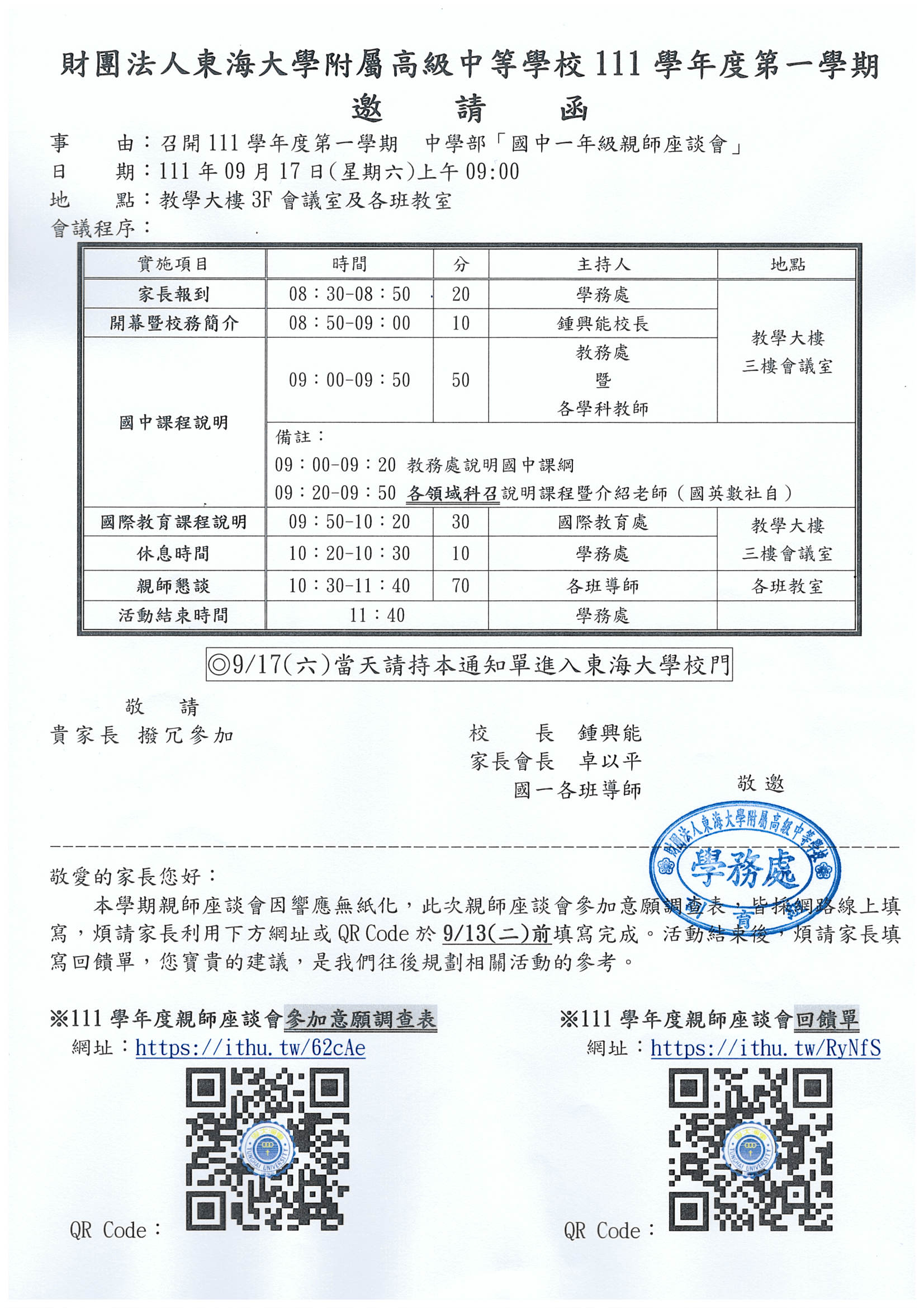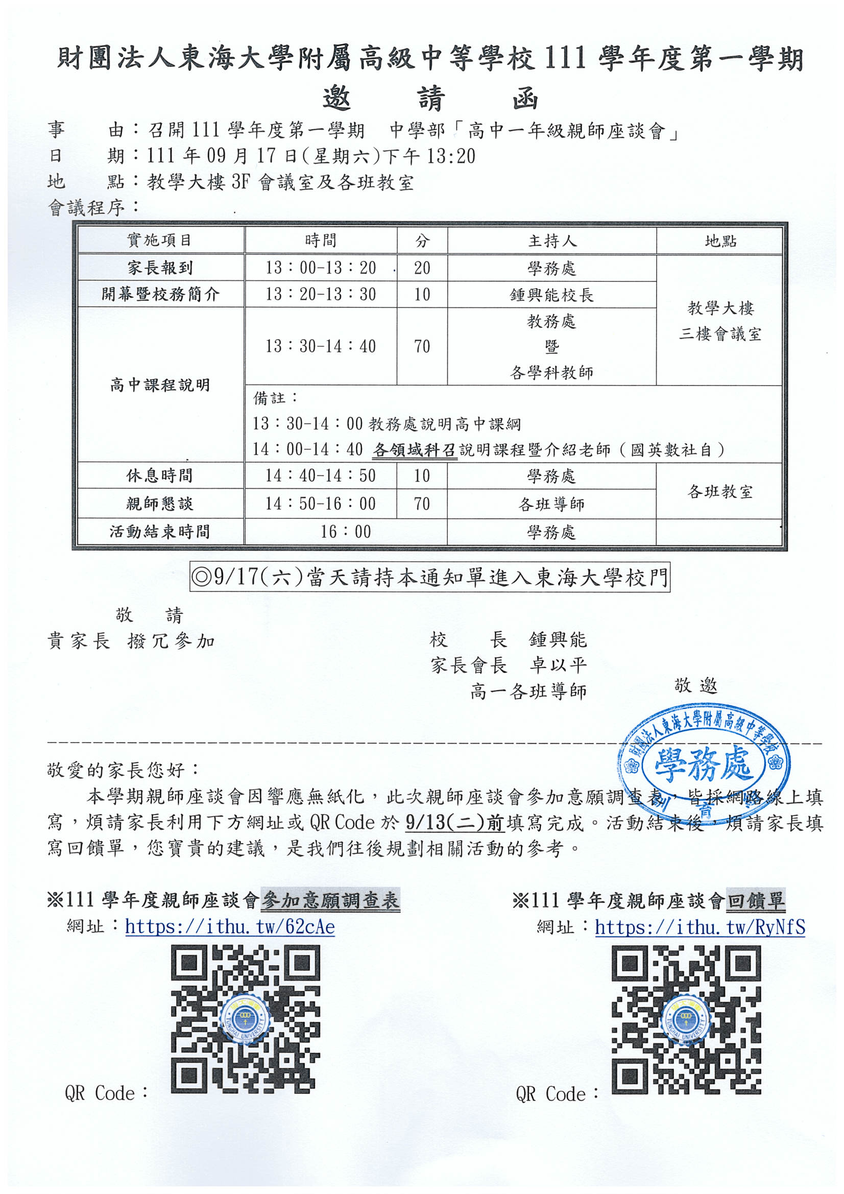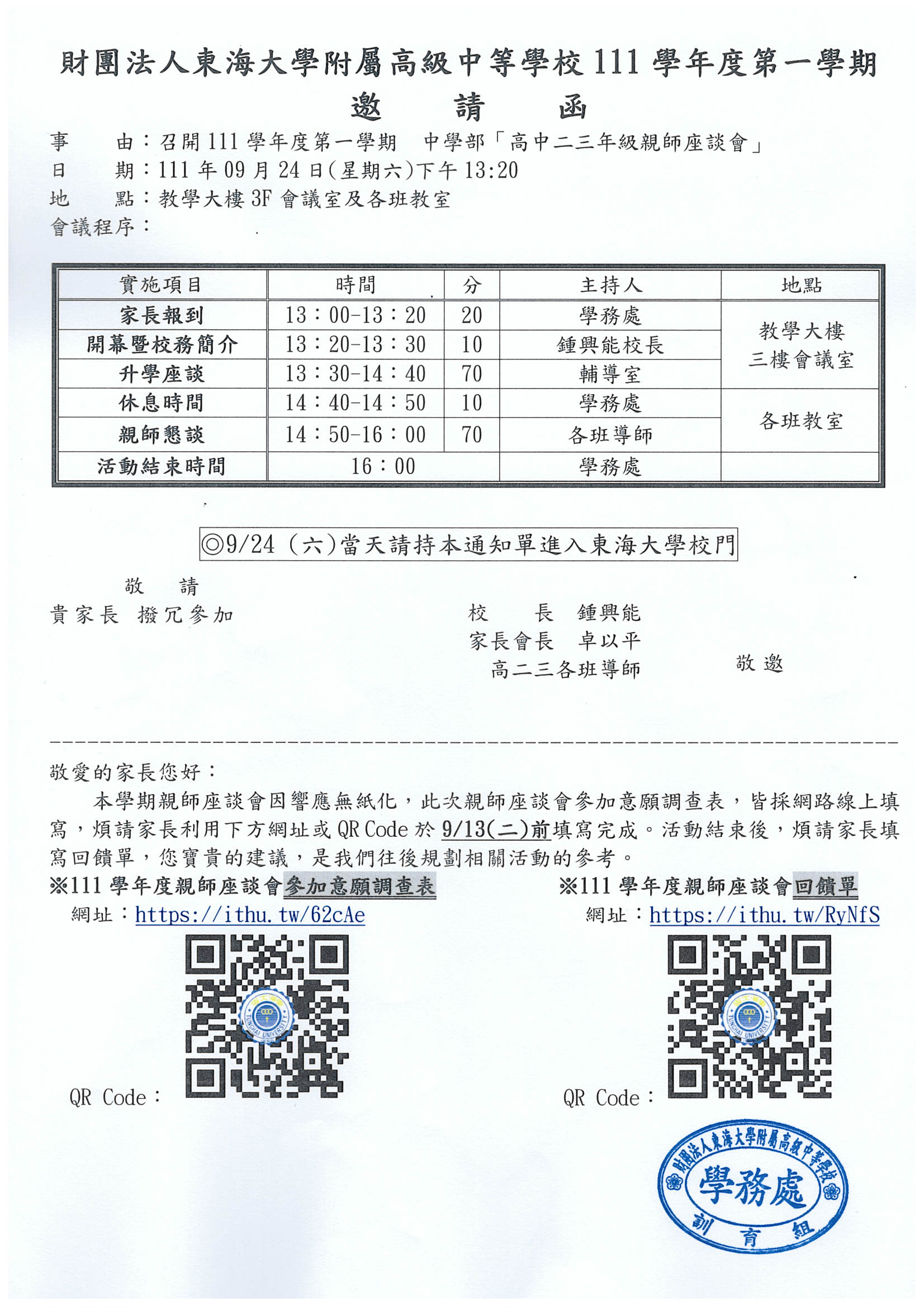 1.親師座談會當天憑「紙本」邀請函進出校門,請家長務必攜帶邀請函。