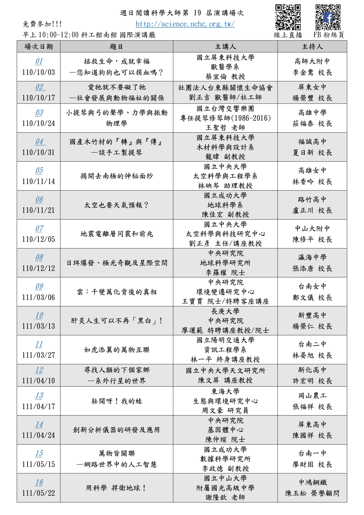本講座詳細日程及時間如附件場次表及海報,演講地點於國....
