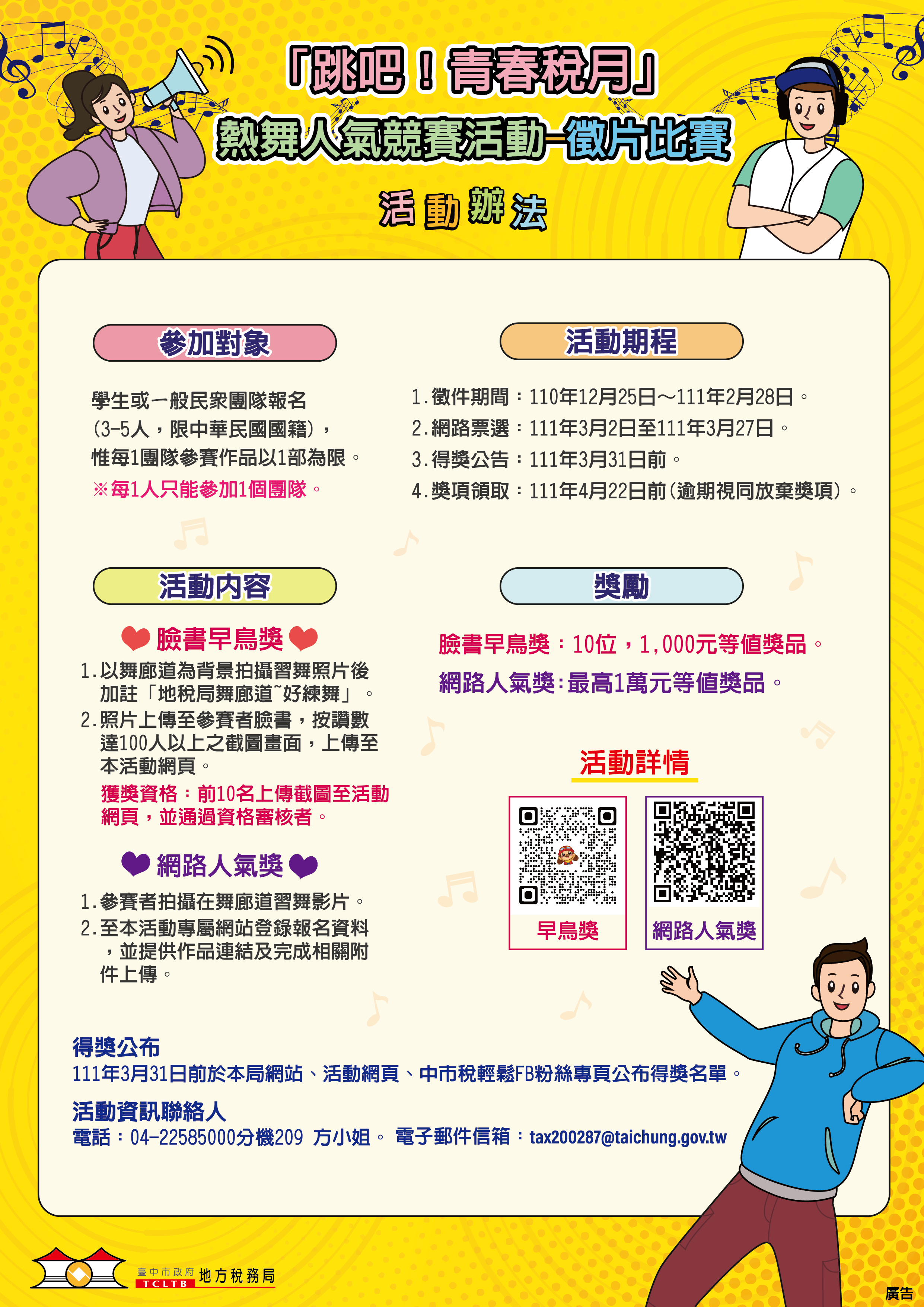 國中組:臺中市各公私立國中學生,每隊人數1至2名,得選定1名隊員擔任隊長,指導老師1名。