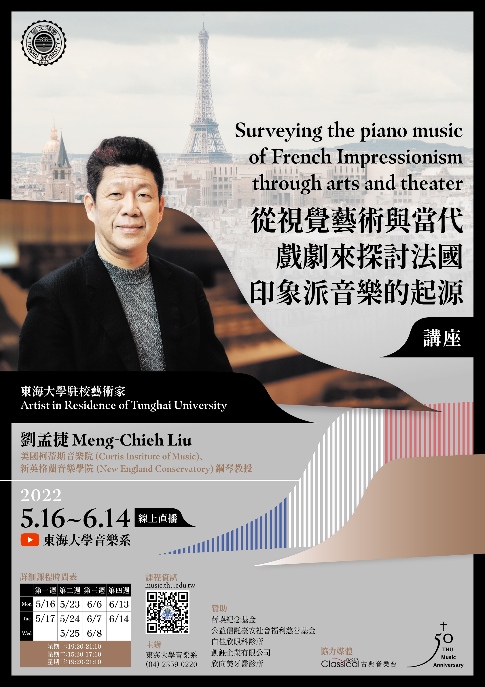 東海大學音樂學系訂於111年5至6月期間舉辦線上鋼琴講座,歡迎有興趣師生同仁踴躍參與,檢附原函如下: