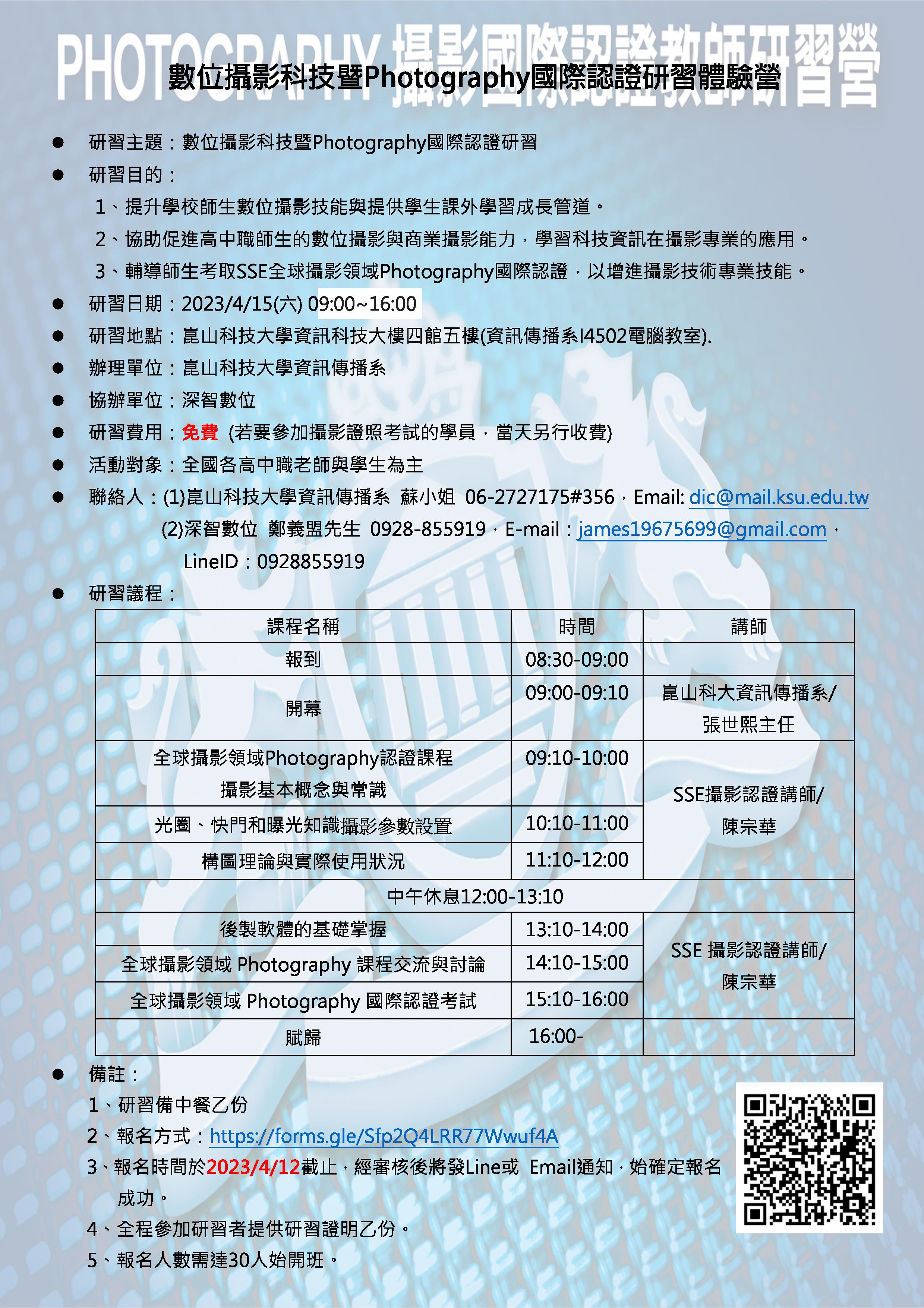 一、本研習之目的為提升學校師生數位攝影技能與提供學生課外學習成長管道,協助促進高中職師生數位攝影與商業攝影能力,學習資訊科技在攝影專業的應用;並藉此輔導師生考取SSE全球攝影領域Photography國際認....