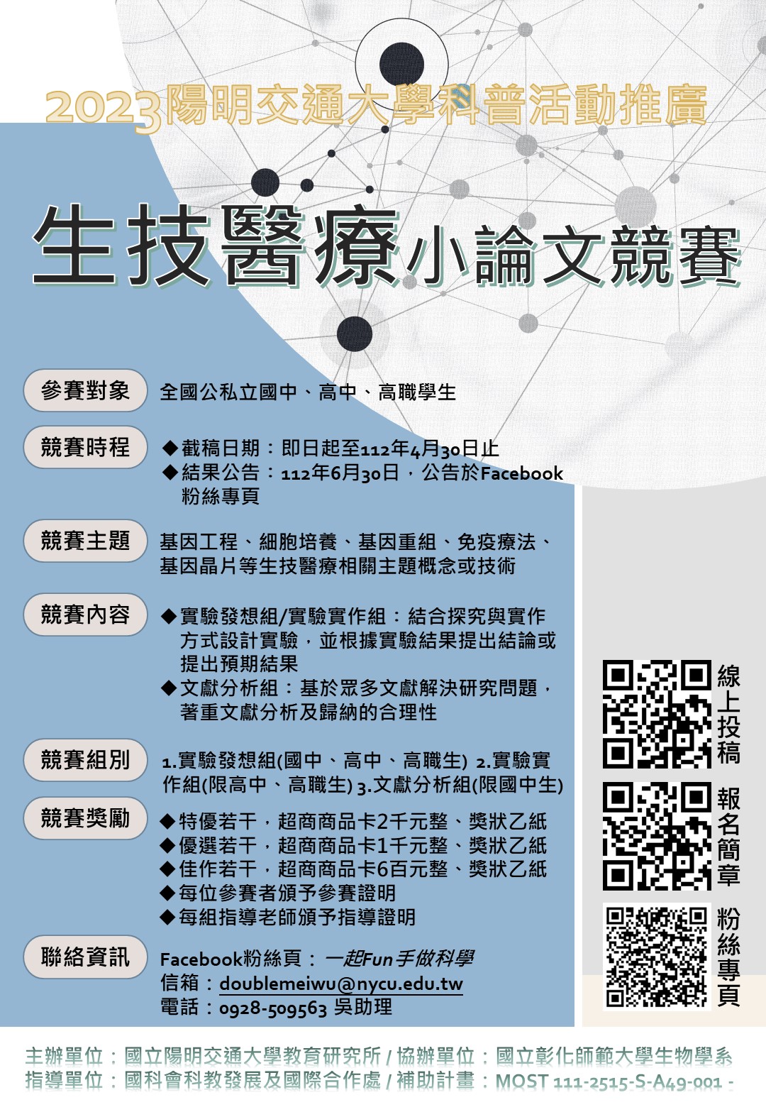 二、收件方式:採線上報名方式,請於截稿日前,將報名基本資料、稿件WORD檔及學生證正反面電子檔上傳至https://forms.gle/1XH93kbWwzQLWRDD9,始完成報名作業....