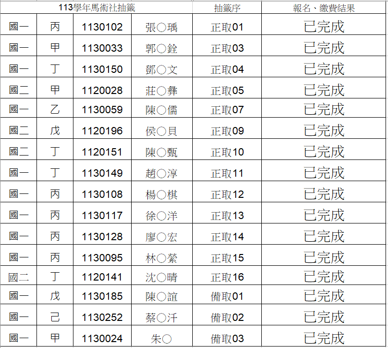 經公告正備取名單,完成後續繳費、填單作業,完成報名程序之學生如下列
