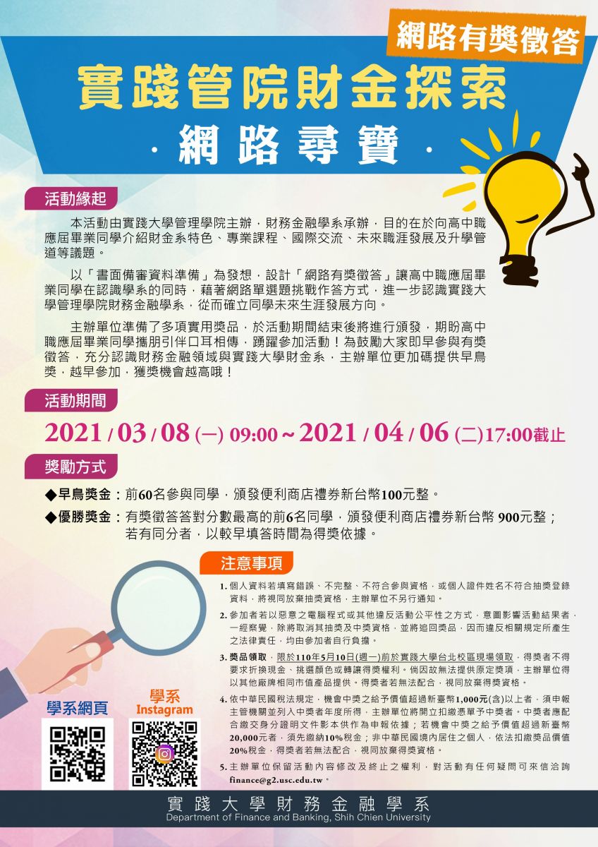 實踐大學財務金融學系辦理「實踐管院財金探索-網路尋寶」網路有獎徵答活動