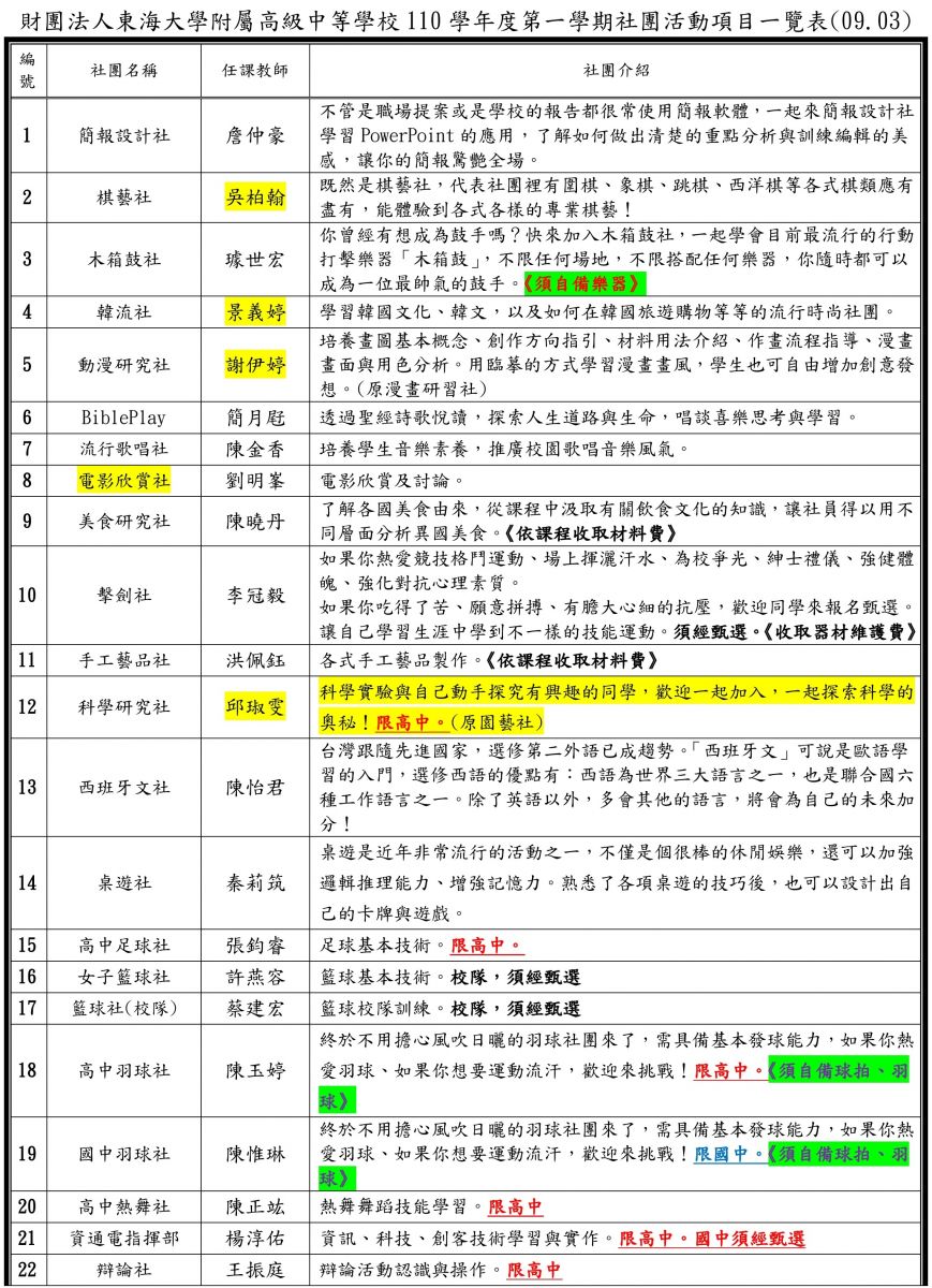 財團法人東海大學附屬高級中等學校--行政公告-110學年度社團介紹及選社說明【09.03更新】