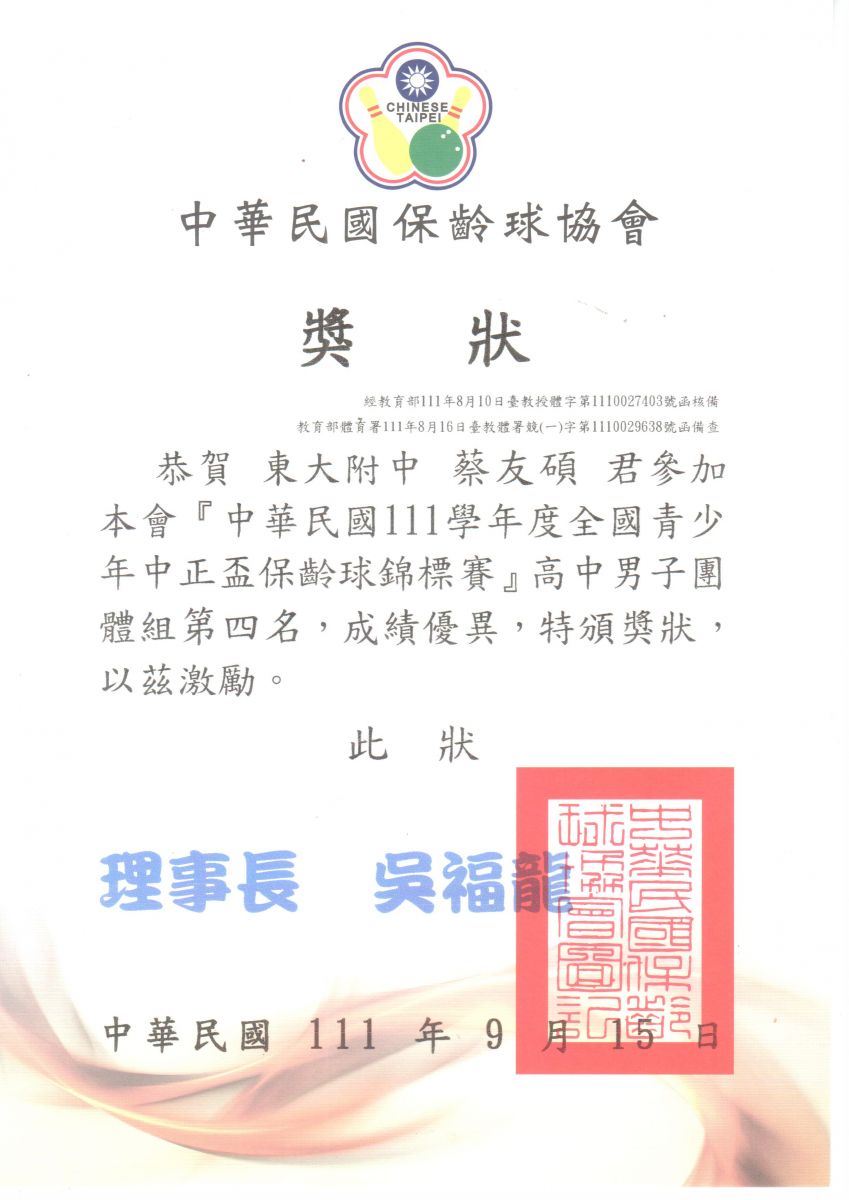 財團法人東海大學附屬高級中等學校--附中新聞-本校高二乙蔡友碩參加全國青少年中正盃保齡球錦標賽 榮獲高男團體組 第四名